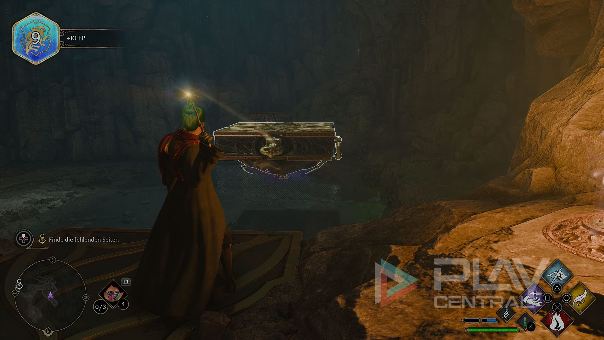 Der Pfad führt euch wieder direkt auf den richtigen Weg, sodass ihr eure Suche nach den fehlenden Seiten fortsetzen könnt. Aber ganz so einfach wird es euch natürlich nicht gemacht. Wieder landet ihr vor einer schwebenden Plattform und müsst euch mittels Accio über einen Abgrund befördern.