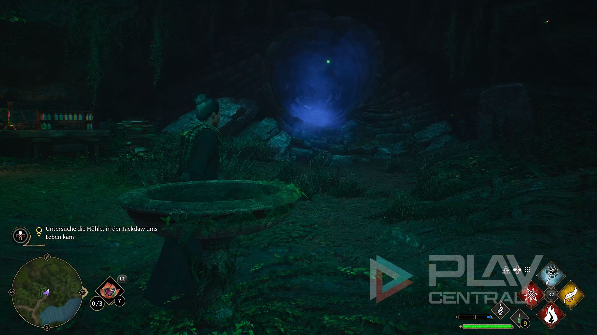 Hier biegt ihr wieder links ab und lauft geradewegs auf Jackdaws Grab zu. Direkt bei der Höhle befindet sich auch ein Schnellreisepunkt. Interagiert nun mit der Wasserschale, um den geheimen Eingang zu öffnen.