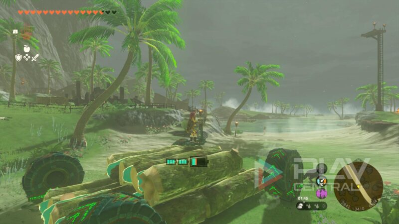 Dafür müssen wir die beiden Holzbretter zu einer L-Form miteinander verbinden. Dieses neue Brett könnt ihr im Anschluss ins Wasser stellen, um sie mit Link zu betreten.