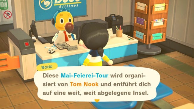 Sprecht dafür einfach mit Tom Nook im Servicecenter. Jeder bekommt hierbei ein einziges Mai-Feierei-Ticket, das am Flughafenschalter für euch hinterlegt wird. Kein Wunder, dass ausgerechnet Nook diesen Tag zelebriert. Am internationalen Tag der Arbeit werden immerhin alle geehrt, die hart arbeiten und hart arbeiten muss man für Nook auf jeden Fall.