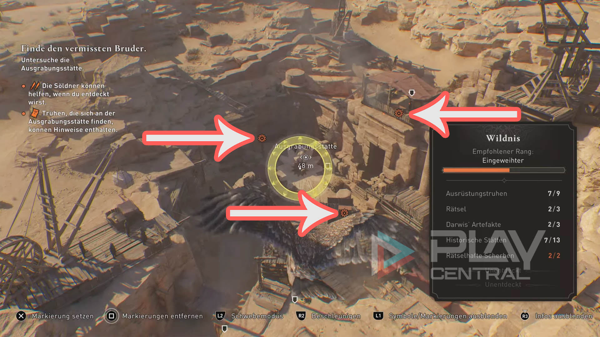 Es gilt nun erst einmal, mehrere Punkte mit Hinweisen zu spotten. Schickt also euren Adler vor und markiert die drei Punkte auf der Karte, damit ihr sie später nur noch heimlich ablaufen müsst. Enkidu spottet die Gräber, die ihr ansprechen solltet.