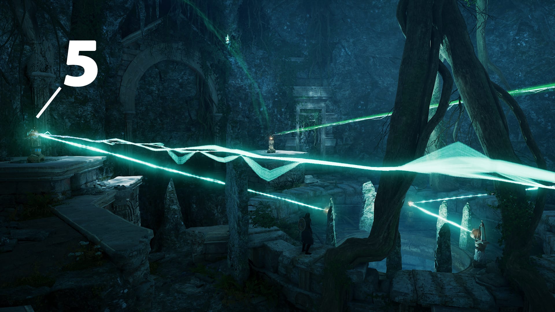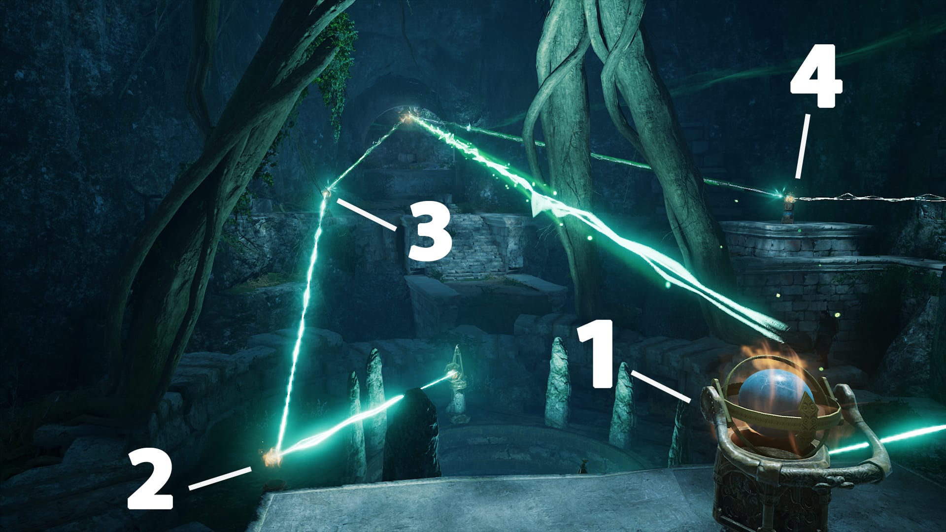 Ihr betretet zu Beginn eine große Höhle in deren Mitte sich ein kreisförmiges Loch befindet, durch das ihr aber erst gelangen könnt, wenn ihr das Siegel der Quelle gebrochen habt. Eure Aufgabe besteht daran, die Lichtstrahlen entsprechend umzulenken, dass diese jeweils auf die zwei Säulen bei dem Loch treffen.