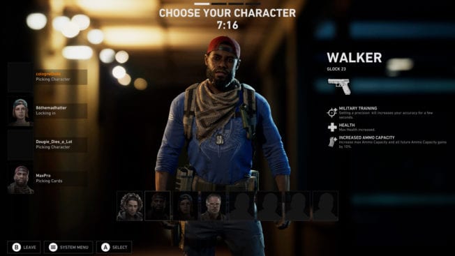 Vor jeder Partie wählen wir unsere Spielfigur aus. Im Gegensatz zu „Left 4 Dead“ besitzen die Cleaner eine Reihe von Fähigkeiten und variieren somit in puncto Lebensenergie, Tempo, Durchschlagskraft und Ausrüstung. Walker beispielsweise ist der „Damage-Dealer“ in der Runde. Er verfügt über eine Extra-Portion Lebensenergie und kann zudem zusätzliche Munition mit sich tragen. Als Sekundärwaffe besitzt er eine Glock 23.