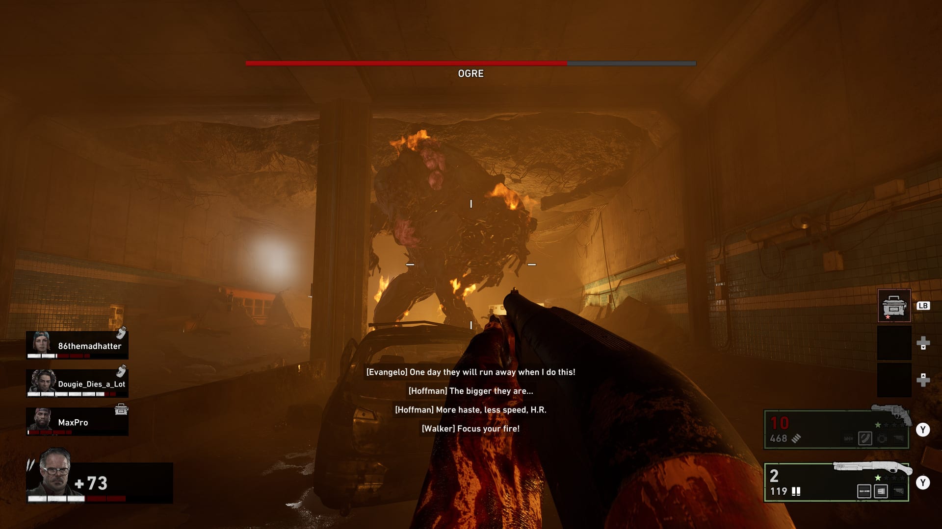 Dieses Ungetüm lässt nämlich den Tank aus „Left 4 Dead“ wie ein Schulkind aussehen und erhebt sich aus dem Erdboden wie ein Seeungeheuer aus dem Meer. Der Oger zeigt keinerlei Reaktion auf normalen Beschuss und kann uns sogar aus Gebäuden herausziehen. Als wir uns etwa in einem Tunnel in einen Nebenraum flüchteten, staunten wir nicht schlecht, als plötzlich eine riesenhafte Klaue durch den Eingang ragte.