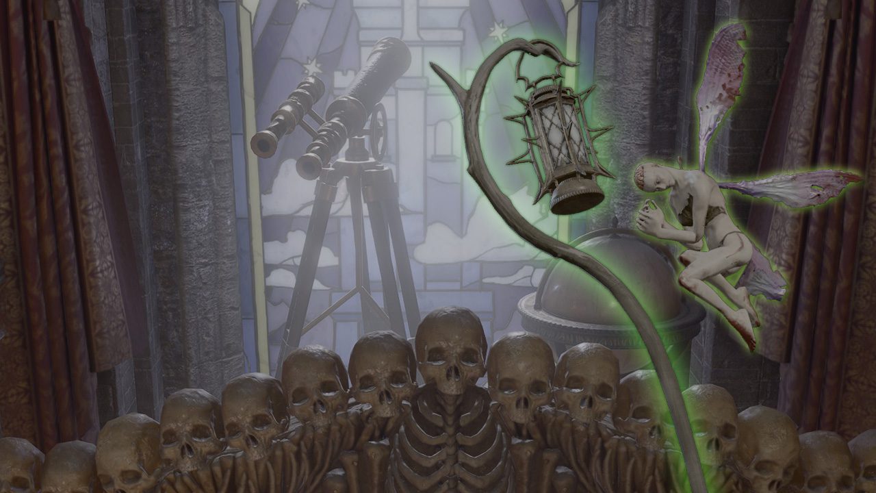 Jetzt wird es spannend, denn in dem kleinen Labor in Balthazars Raum findet ihr einen grün leuchtenden Ritualkreis auf dem Arbeitstisch und daneben kaputte Mondlaternen und tote Pixies. Hier ist Gale gefragt.