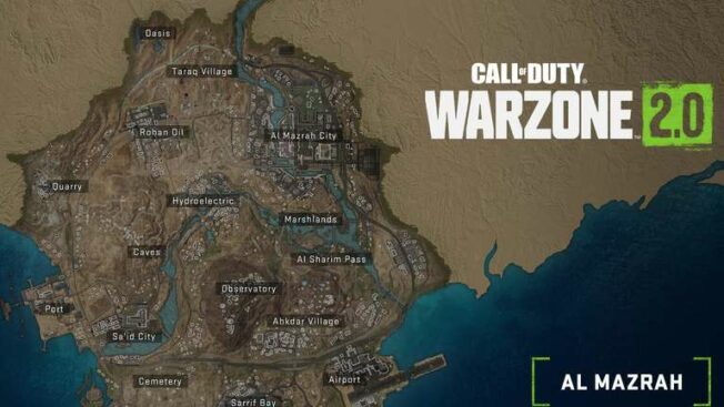 Zudem wird es eine Stadt, Öl-Anlagen, Häfen, sowie ländliche Zonen mit Ruinen, Marschland und ein verlassenes Dorf geben. Wie im Battle-Royale üblich, wird die Map während des Gefechts immer wieder verkleinert werden. Neu ist, dass in „Warzone 2.0“ in bis zu drei Zonen gekämpft werden wird, die von Sandstürmen begrenzt werden. Zum Ende einer Runde werden die drei Zonen zu einer vereint – damit wird das Finale eingeläutet. Im folgenden Bild könnt ihr euch die Map schon einmal ansehen.