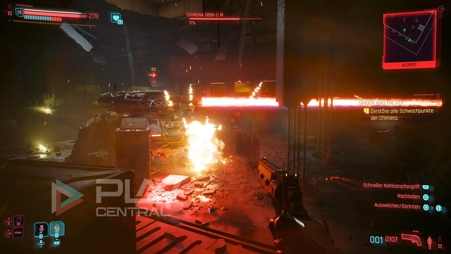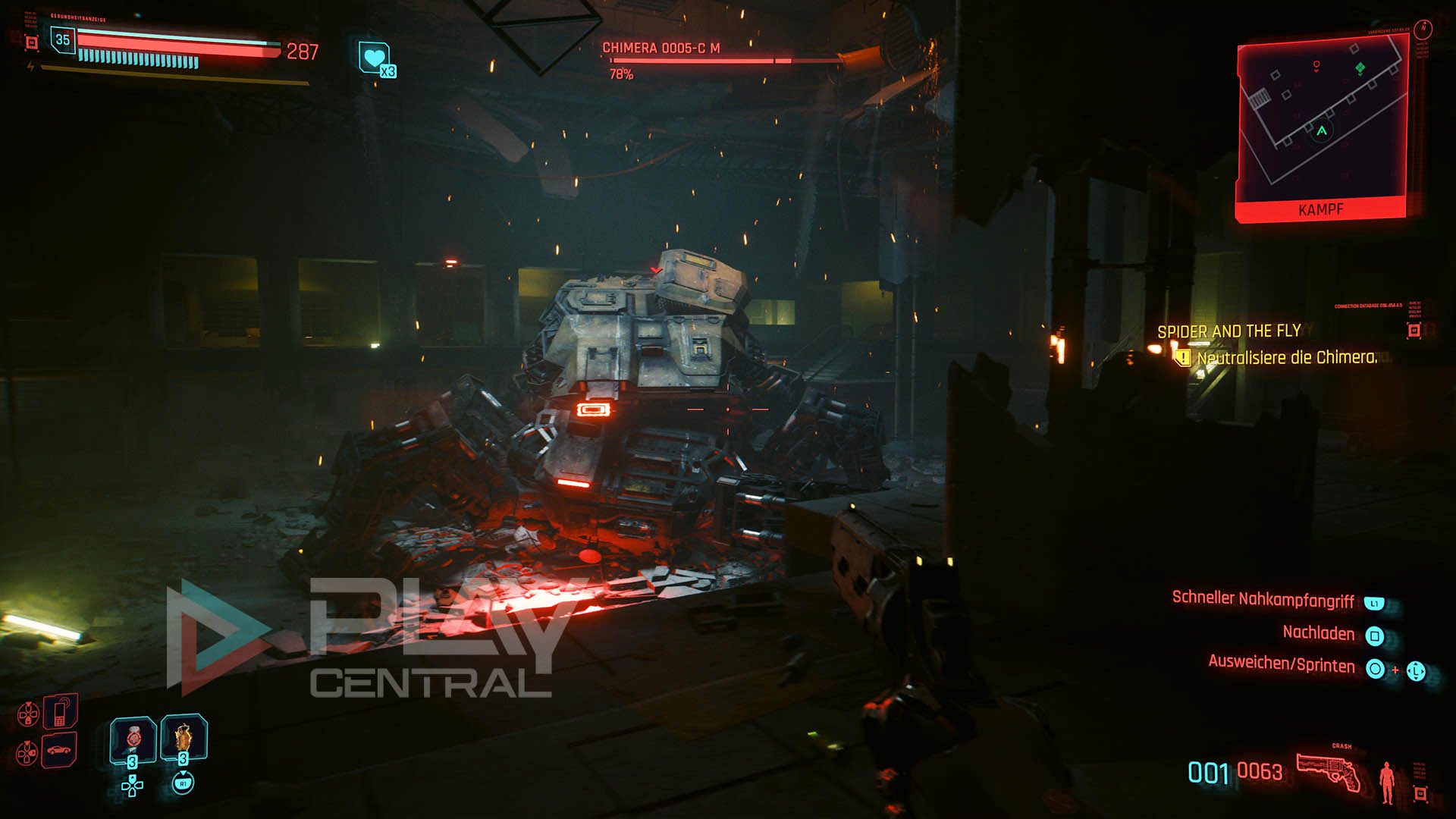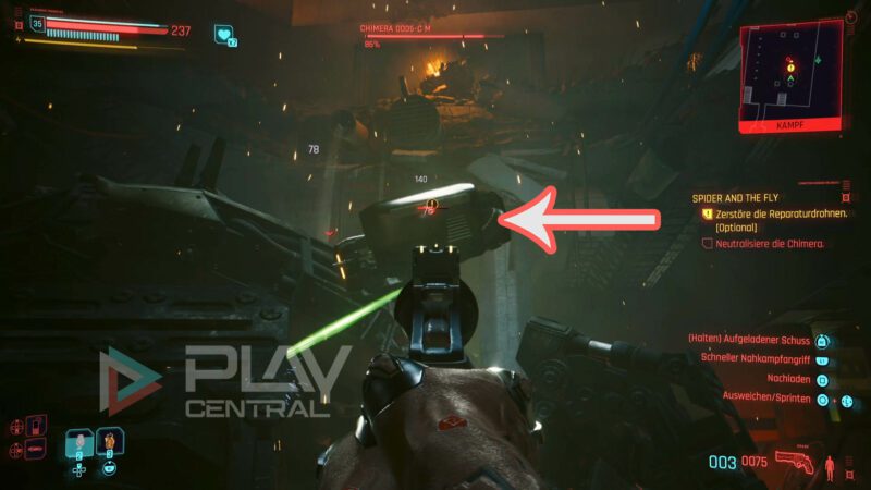 Da es sich um eine Maschine handelt, zückt EMP-Granaten und hackt immer mal wieder einen Kurzschluss über eure Quickhack-Funktion rein, der Chimera freut sich!