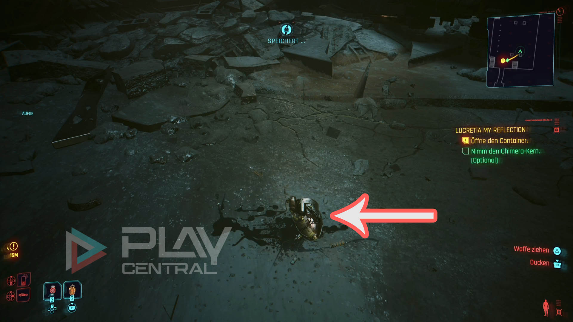 Wichtig: Vergesst nicht die optionale Quest. Sammelt den Chimera-Kern ein, der jetzt hier irgendwo in der Ecke herumliegt. Er ist schwer zu finden, liegt aber eigentlich nur wenige Meter von Myers entfernt (siehe Bild).