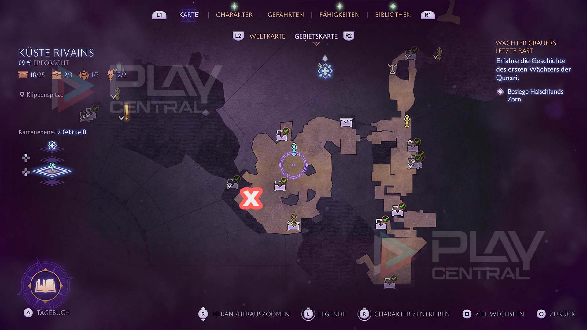 Starte im zentralen Gebiet von Rivain, an der sogenannten Klippenspitze. Von hier aus läufst du keine paar Meter gen Süden, bis du auf ein steinernes Gebäude triffst. Im Inneren des Gebäude siehst du rechts außen (nordwestlich) eine Griffon-Zeichnung.