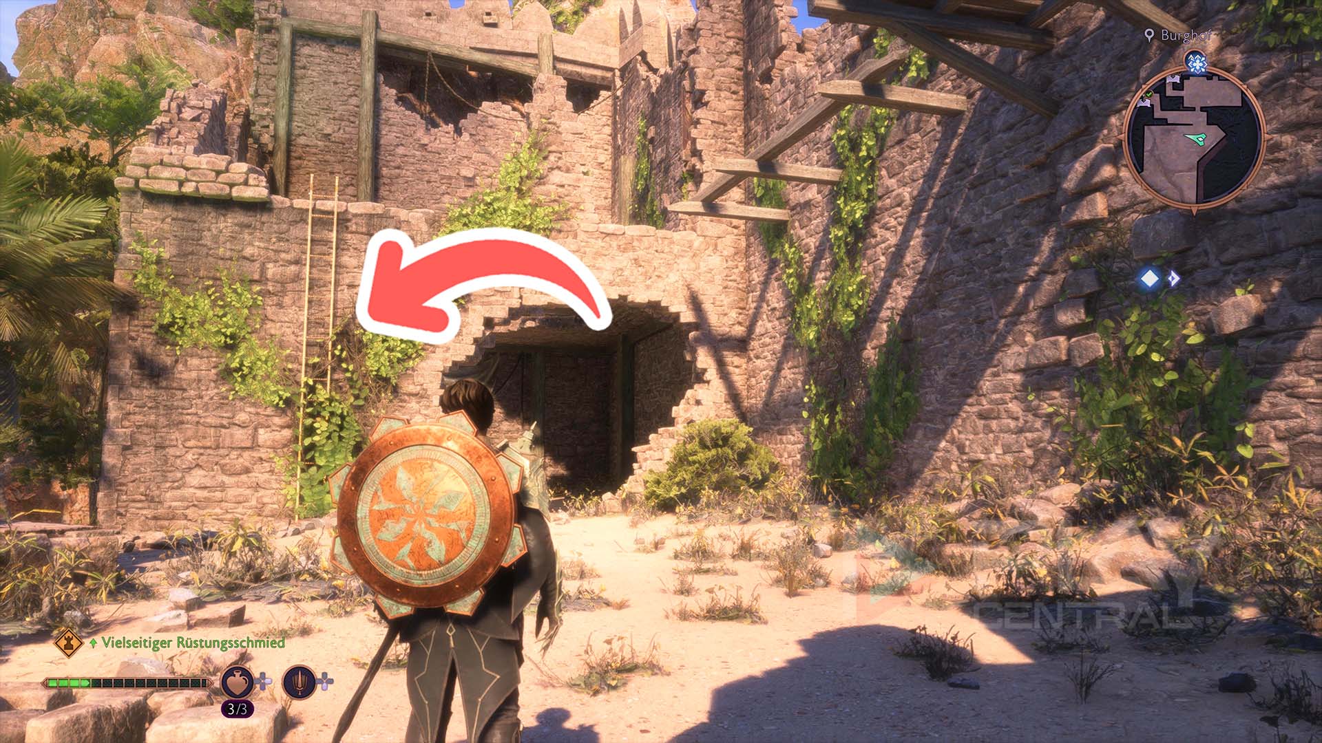 Der Weg nach Haischlunds Zorn: Laufe nun vom Torbogen aus wieder ein Stück weit zurück gen Westen, bis du eine Leiter siehst, die nach oben führt. Laufe einmal über die Holzbrüstung und dann nach Norden ins Innere der Festung.
