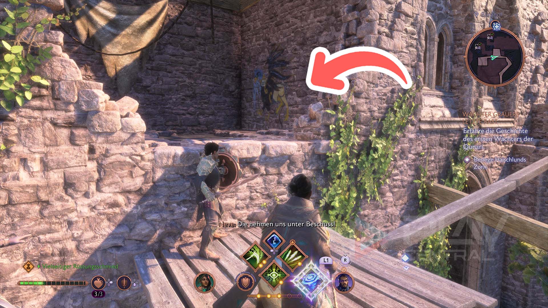 Für den dritten Hinweis läufst du in Richtung des Statuen-Rätsels. An der markierten Stelle ist allerdings kein Hinweis zu finden, weil sich der Hinweis auf der unteren Ebene befindet. Klettere also südwestlich an der Leiter nach unten und aktiviere Bosheit (von Lucanis), der dir den Weg temporär freilegt. Klettere über die Brüstung und am Ende des Weges findest du die dritte Statue mit dem nächsten Hinweis.