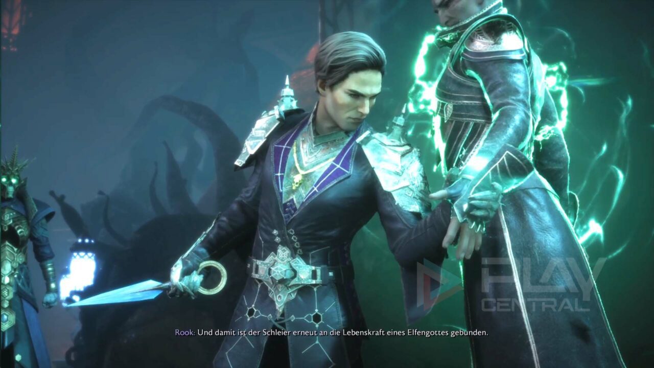 Zunächst einmal erinnert Rook Solas daran, dass er sein Gefängnis aus Reue hinter sich lassen müsse. Daraufhin bekommt er den Dolch überreicht. Doch Solas reichen die Worte von Rook nicht aus, weshalb er den Schleier trotzdem zerstören möchte.