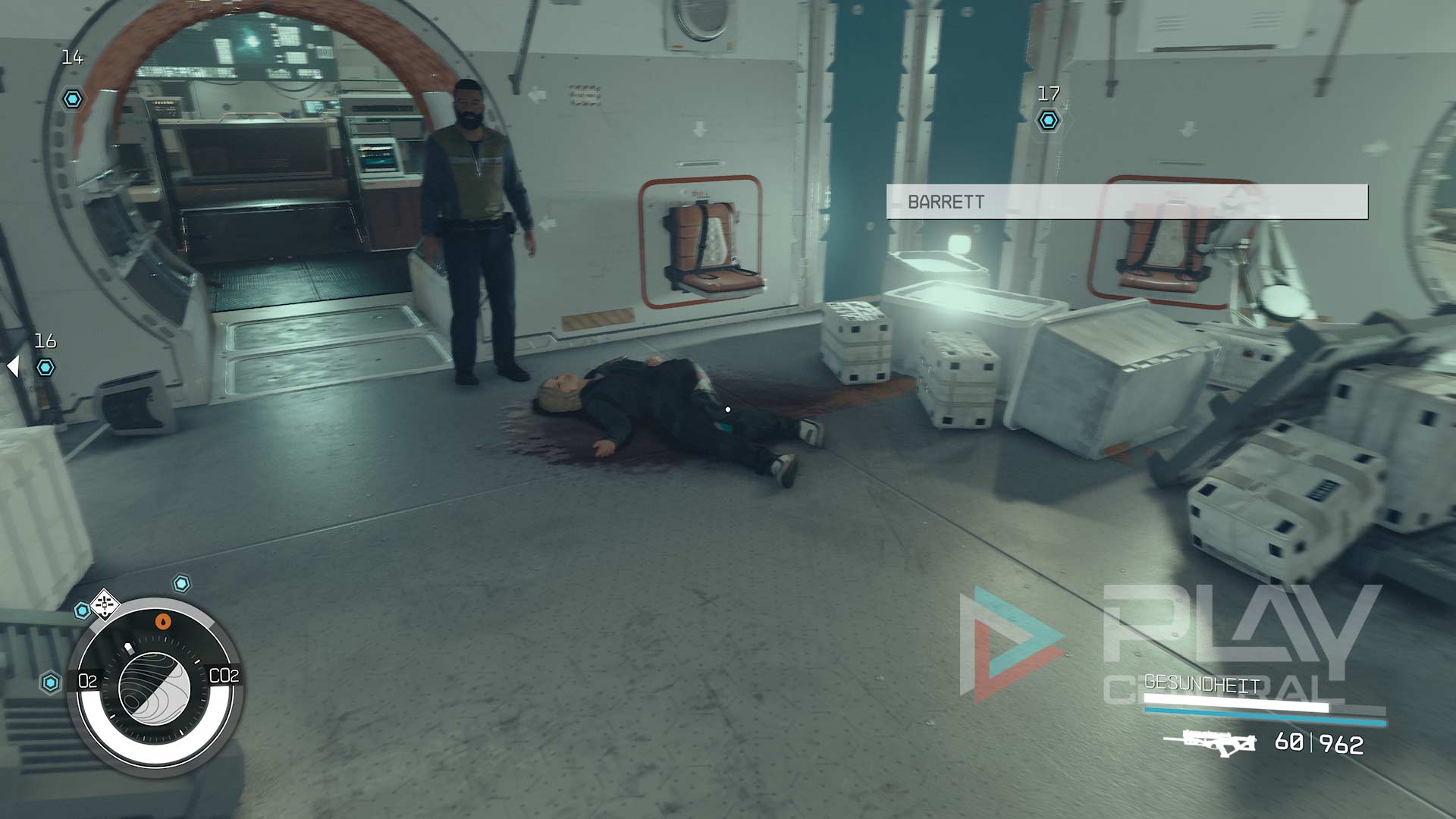 In der Raumstation angekommen solltet ihr nach euren Begleitern schauen, die verletzt in verschiedenen Teilen des Auges liegen. Einer eurer Begleiter wird tot auf dem Boden helfen, ihr könnt ihn nicht retten!