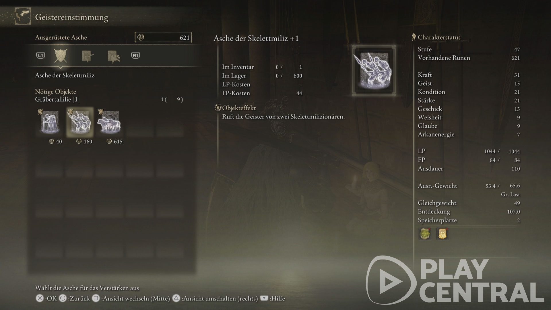 Ab sofort gelangt ihr bei Roderika in das Menü zur Geistereinstimmung, um mit Runen und Gräbertallilien Geister zu verstärken. So kostet es euch beispielshalber 160 Runen, um die Skelettmiliz auf +1 zu verstärken.