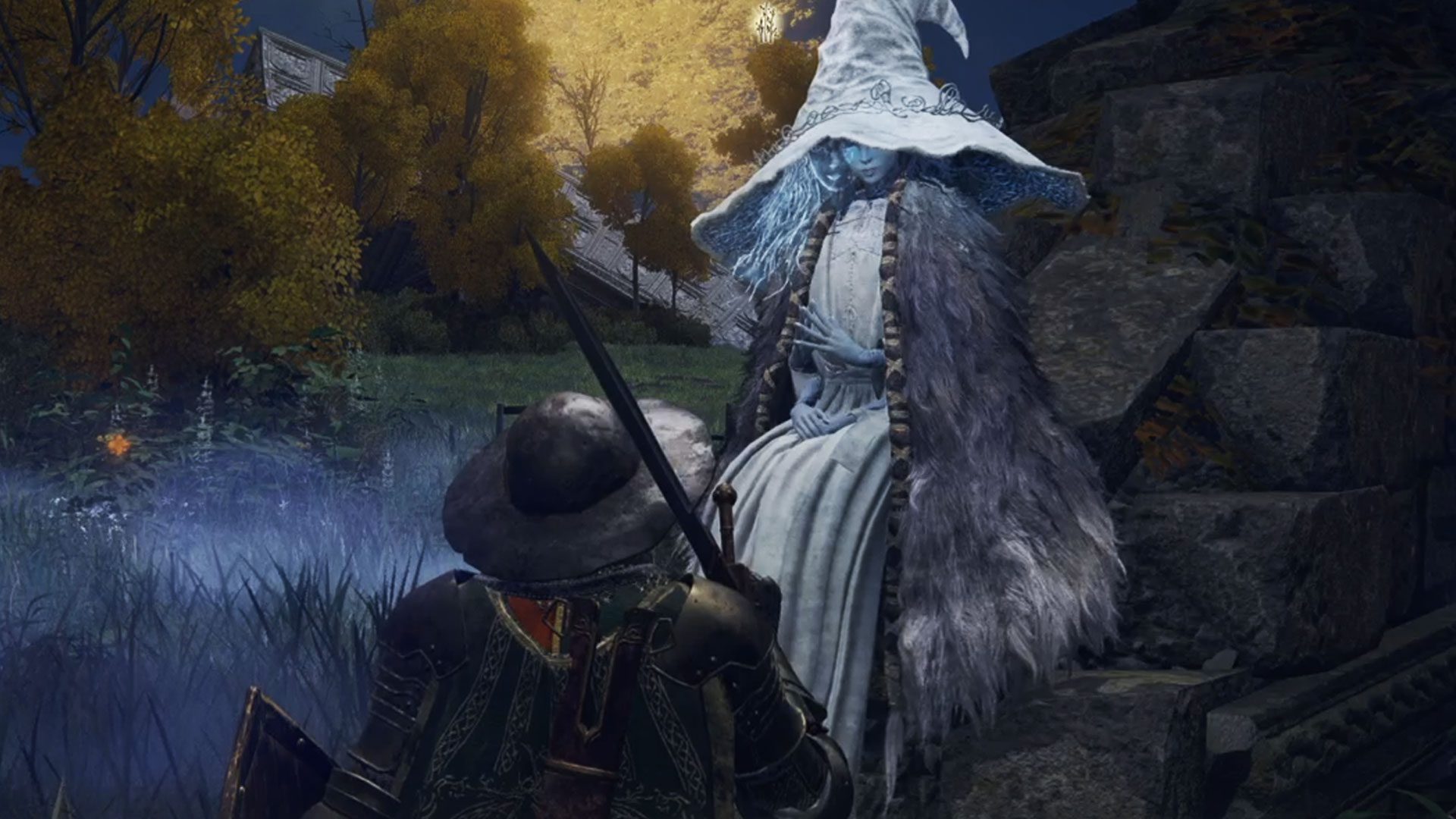 Als nächstes teleportiert ihr euch über einen Ort der Gnade zurück in das Startgebiet zur Kirche von Elleh. Darin befinden sich ein Ambos zum Verbessern eurer Waffe, der Händler Kalé sowie ein weiterer Ort der Gnade. Bei eurer Ankunft sollte die Hexe Renna auf einer Steinmauer sitzen und euch zu sich bitten.