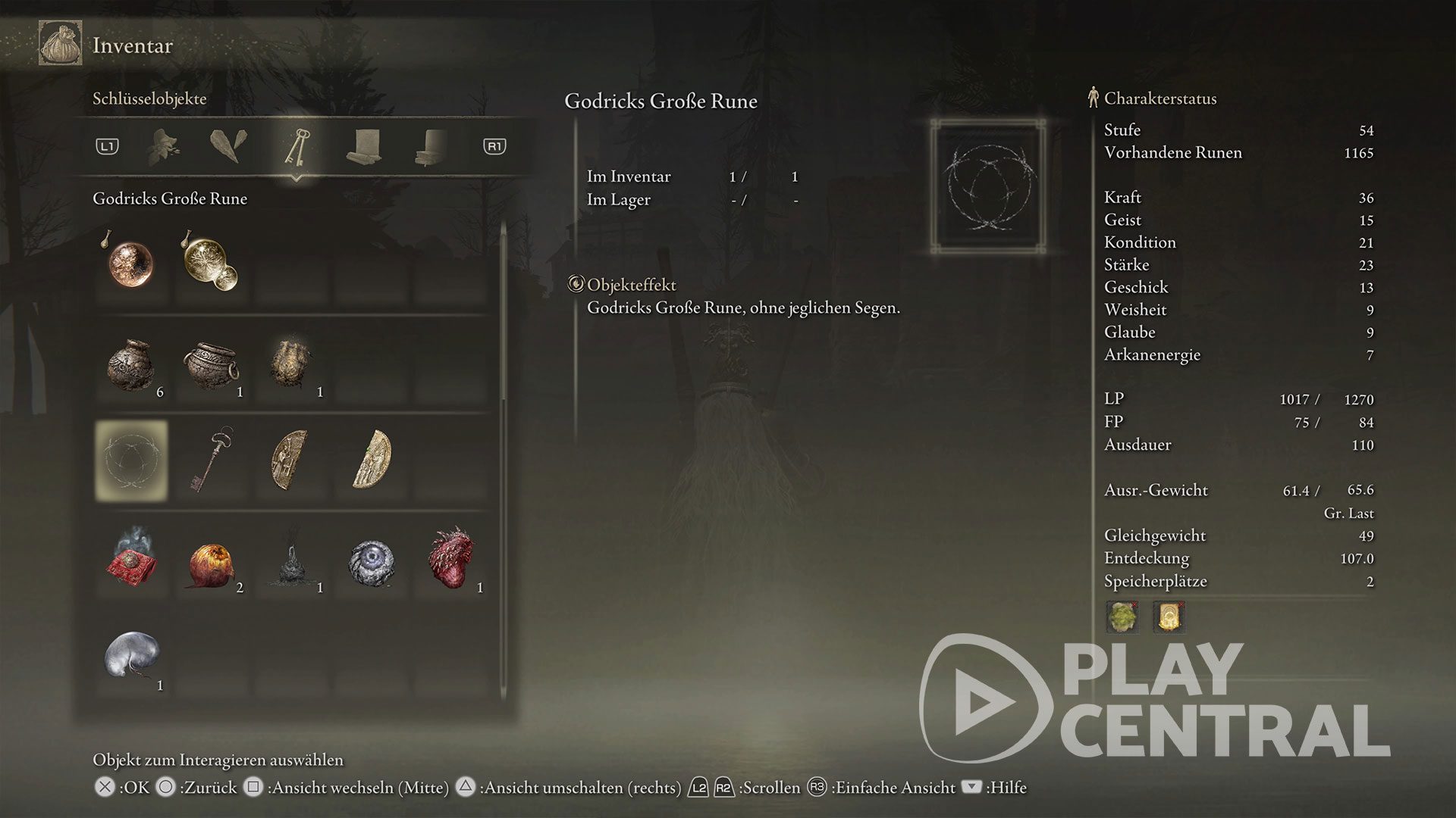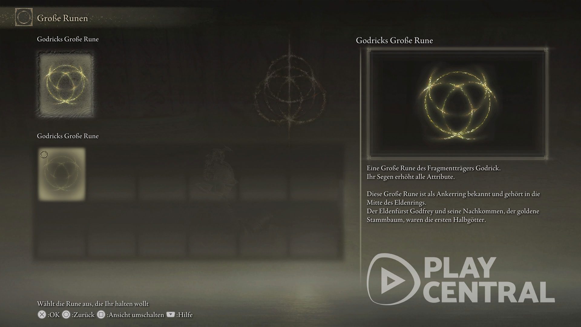 Geht ihr jetzt die Treppenstufen zum zuvor entdeckten Ort der Gnade zurück, findet sich dort der neue Eintrag Große Runen. Darüber gelangt ihr in das Menü für Große Runen, deren Macht wiederhergestellt wurde.