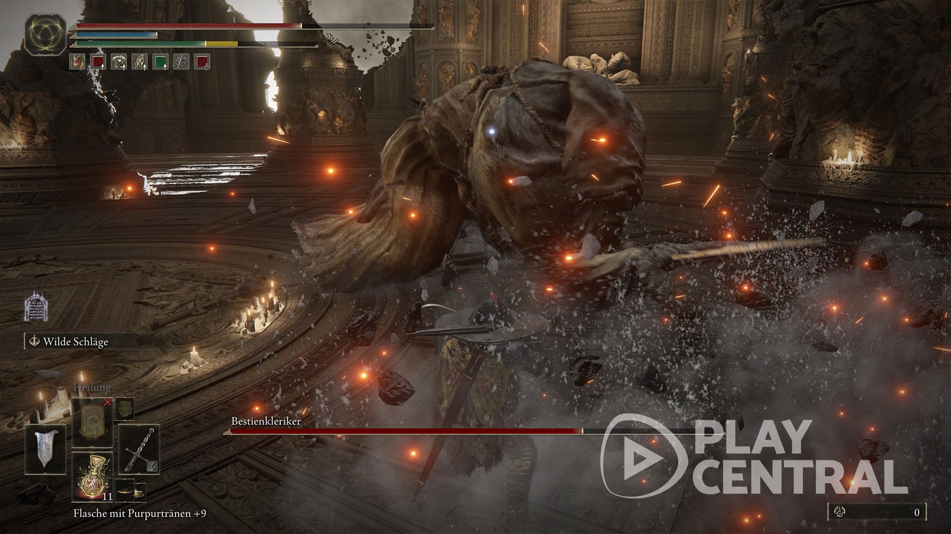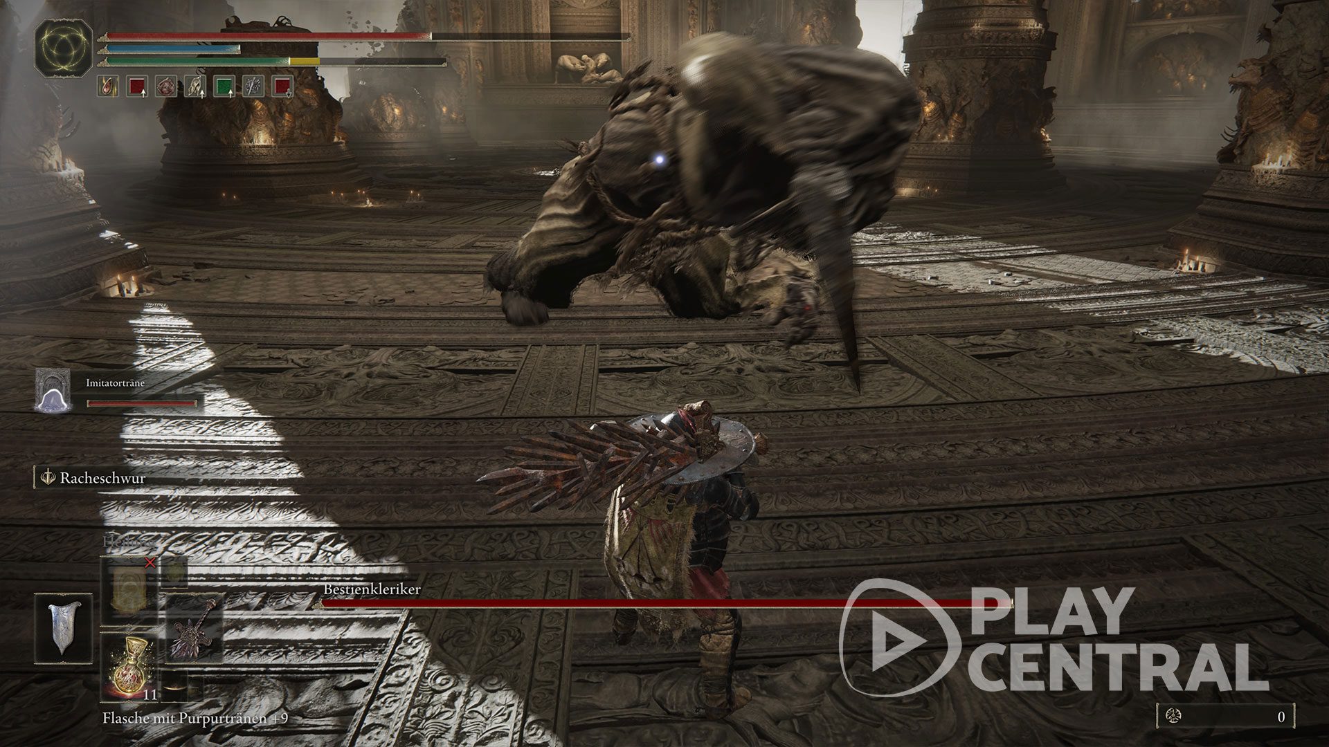 Zwischen den Attacken gibt es immer wieder kleine Zeitfenster, die ihr für einen Gegenangriff nutzen könnt. Um euch die Sache etwas einfacher zu machen, könnt ihr natürlich auf eine Geisterasche zurückgreifen und diese den Bestienkleriker beschäftigen lassen. Währenddessen könnt ihr eine mächtige Nahkampfattacke oder einen Zauber einsetzen und dem Gegner in den Rücken fallen. Wir empfehlen euch die die Imitatorträne oder die Großschildsoldaten, beide auf Stufe +10.