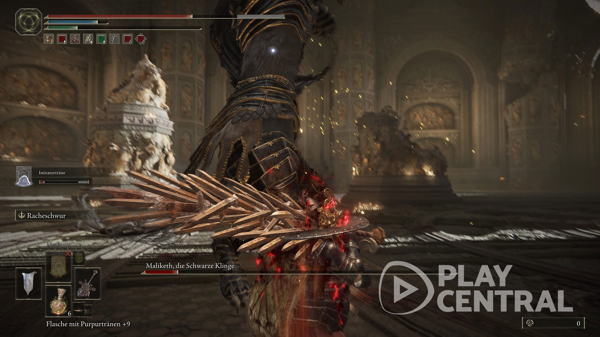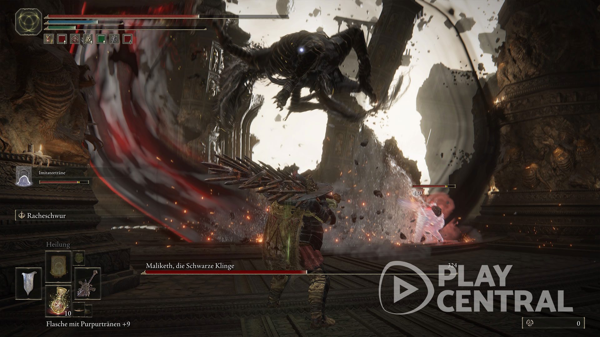 Jetzt beginnt der wahre Bosskampf und für viele „Elden Ring“-Spieler zählte dieses Duell zu den härtesten Konfrontationen im ganzen Spiel und das aus gutem Grund, denn Malekith ist schnell, überaus wendig und hat einige mächtige Attacken auf Lager. Der Dolch ist einem großen Schwert gewichen, das eine gemeine Fähigkeit besitzt: Nach einem Treffer erleidet ihr für wenige Sekunden weiterhin Schaden! Solltet ihr nur noch wenig Lebensenergie haben, kann euch ein solcher Angriff erledigen.