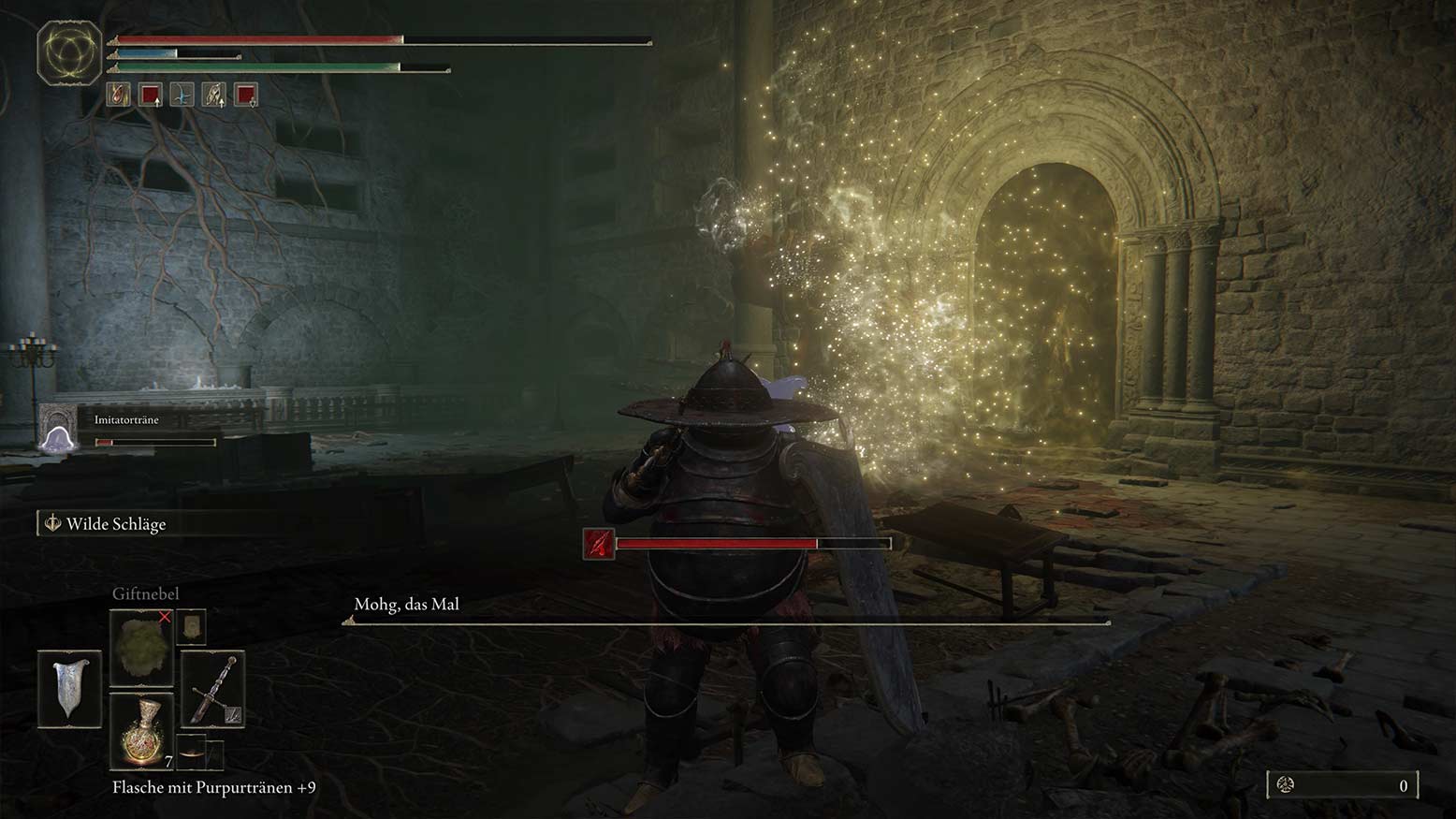 Anders als der „große“ Mohg hat dieser Bossgegner keine zweite Phase. Ihr dürftet entsprechend nach relativ kurzer Zeit bereits alle Attacken gesehen haben, die euer Kontrahent auf Lager hat. Des Weiteren wird er während des Kampfes auch seine Geschwindigkeit oder Stärke nicht verändern. Mit etwas Übung und einem guten Gefühl fürs richtige Timing zwingt ihr den „Elden Ring“-Boss langsam in die Knie.