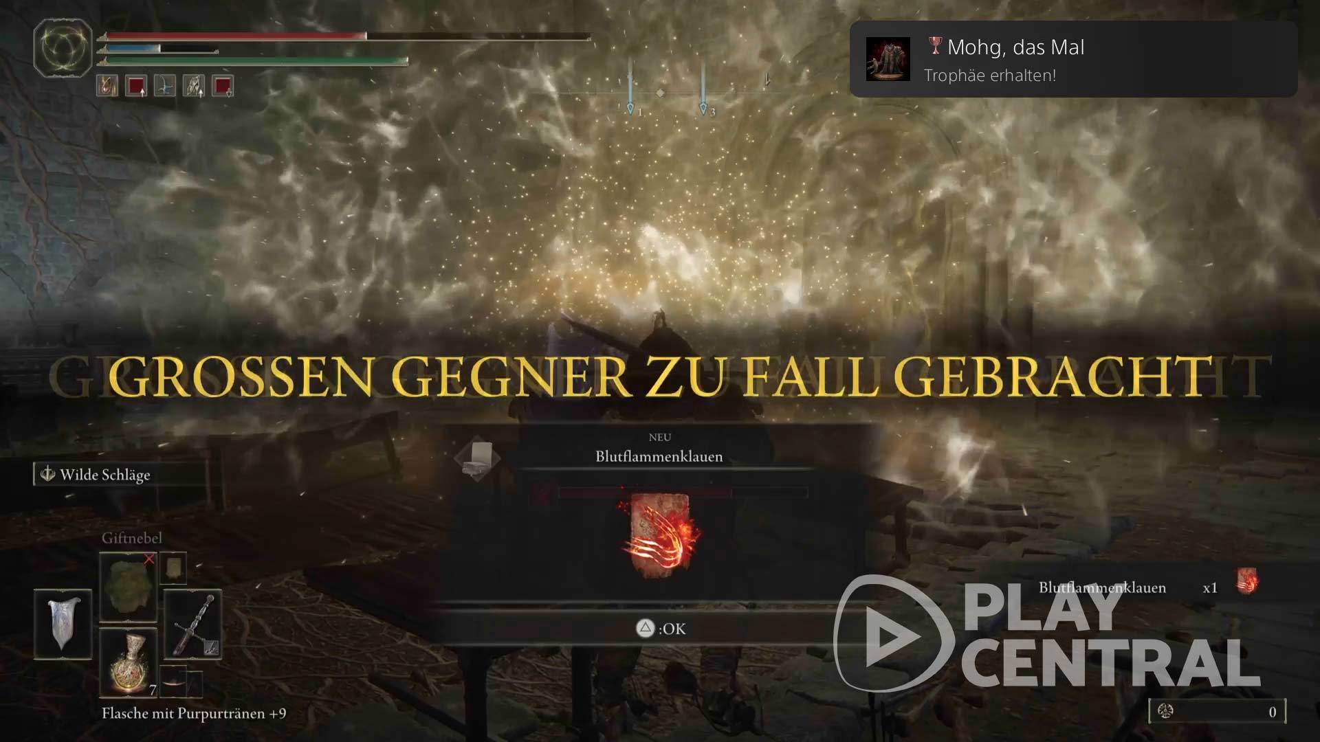 Letztendlich erhaltet ihr für euren Sieg über Mohg, das Mal in „Elden Ring“ insgesamt 100.000 Runen sowie den Zauber Blutflammenklauen.