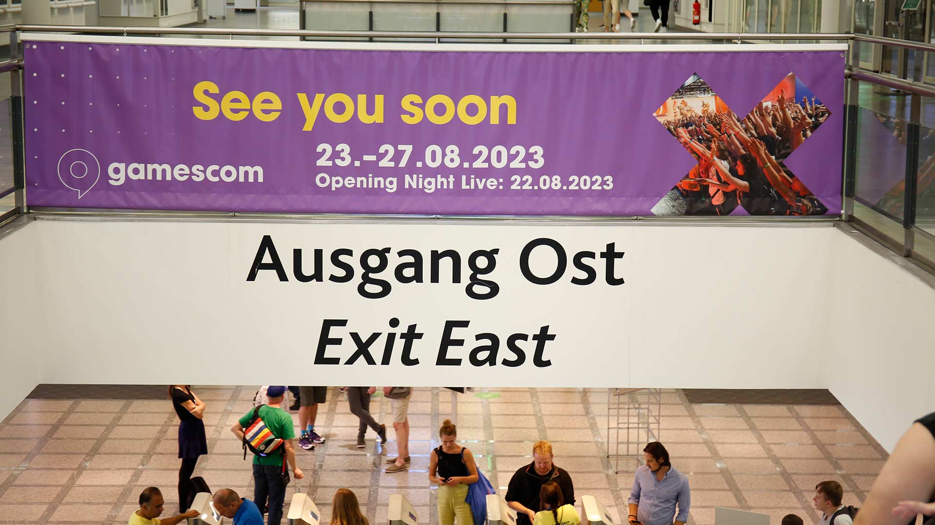 Wie ihr dem Tweet von Host Geoff Keighley entnehmen könnt, werden Besucherinnen und Besucher, die das Messegelände verlassen wollen, mit einem Banner und der Aufschrift See you soon sowie den Daten für nächstes Jahr verabschiedet.