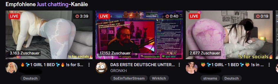 Vor kurzem war auch der bekannte Streamer und YouTuber Erik „Gronkh“ Range auf der Startseite zu unter „Empfohlene Just chatting-Kanäle“ zu sehen, wie er vor rund 17.000 Menschen streamte. Er war hier aber keinesfalls alleine, sondern hatte Gesellschaft von zwei anderen Streamerinnen, die jeweils rechts und links von Gronkhs Stream platziert waren.