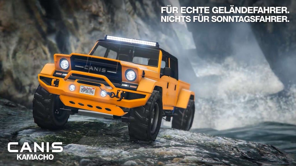 Dieser soll laut der Beschreibung an die glorreichen Tage amerikanischer Allrad-Fahrzeuge erinnern und die Zuverlässigkeit eines Pick-ups und die Widerstandsfähigkeit eines kleinen Schlachtschiffs bieten, ohne aerodynamische Kompromisse einzugehen. "Mit steinhart gefedertem Chassis und der entsprechend spartanischen Innenausstattung eines echten Geländefahrzeugs könnt ihr im Canis Kamacho von oben auf eure Freunde herabblicken. Jetzt erhältlich bei Southern San Andreas Super Autos."