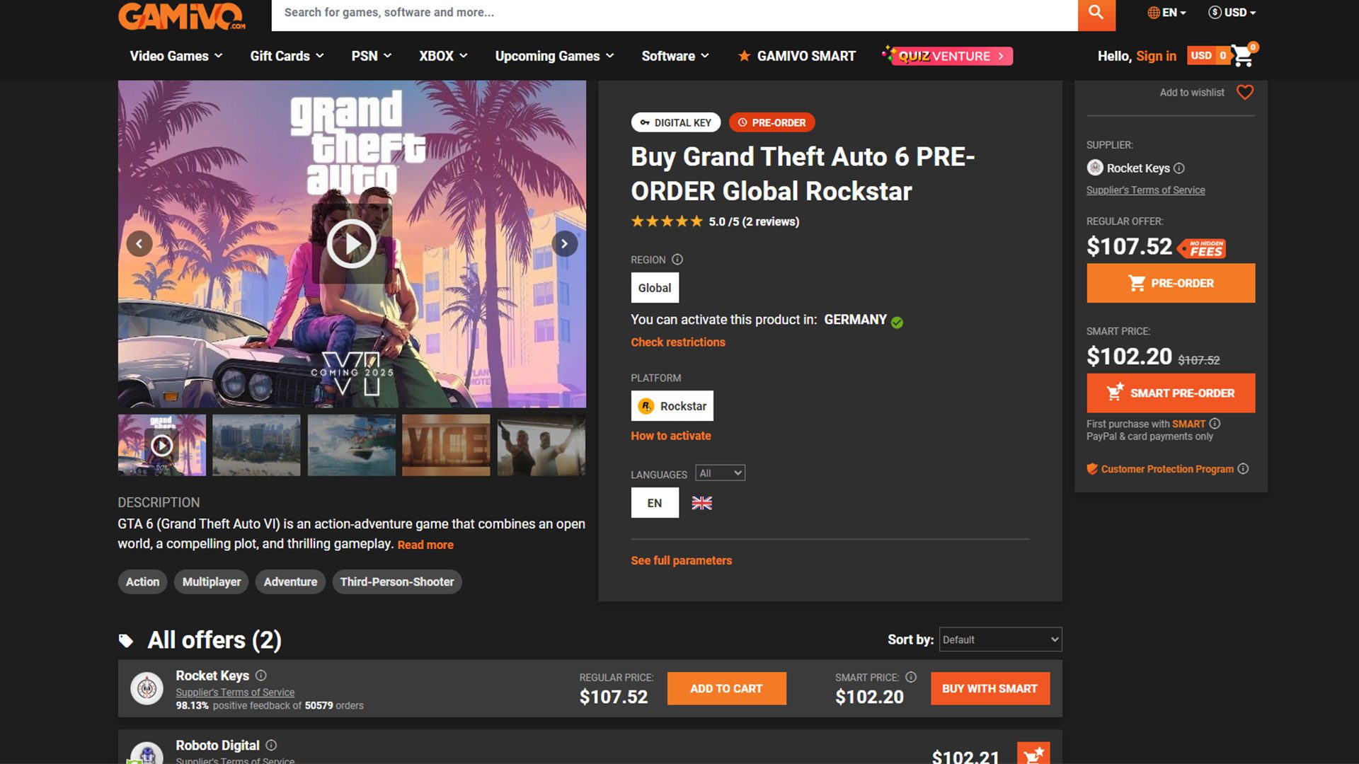 Auf der Plattform des Onlinehändlers Gamivo bieten ebenfalls zwei Verkäufer GTA 6 im Vorverkauf für 102,21 bzw. 107,52 US-Dollar an, was rund 100 Euro entspricht.