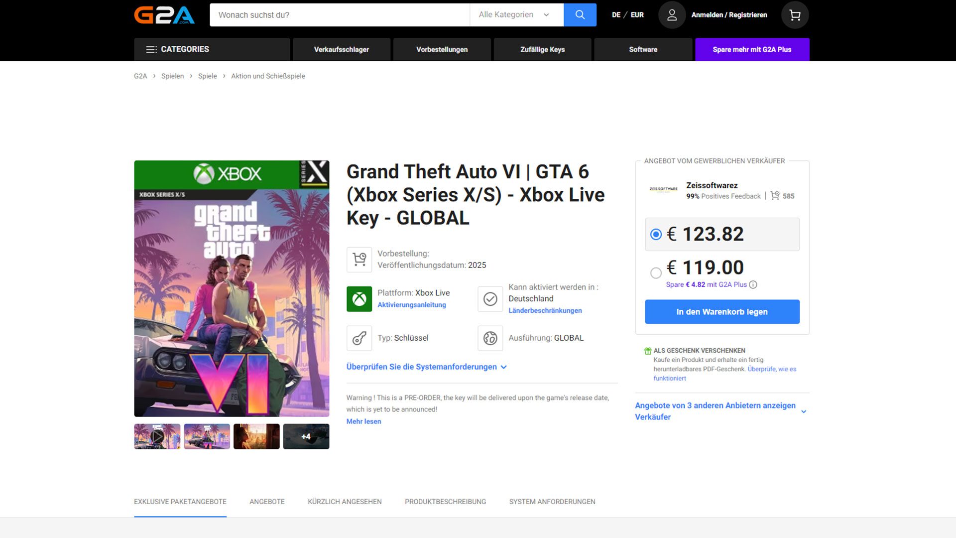 So bieten drei verschiedene gewerbliche Verkäufer im Onlineshop des Key-Reseller G2A einen Key von GTA 6 für die Xbox Series X|S für stolze 123,82 Euro bis 125,00 Euro an. Als Veröffentlichungsdatum wird lediglich das Jahr 2025 angegeben, die Verkäufer besitzen diesbezüglich also offenbar über keine weiteren Informationen.