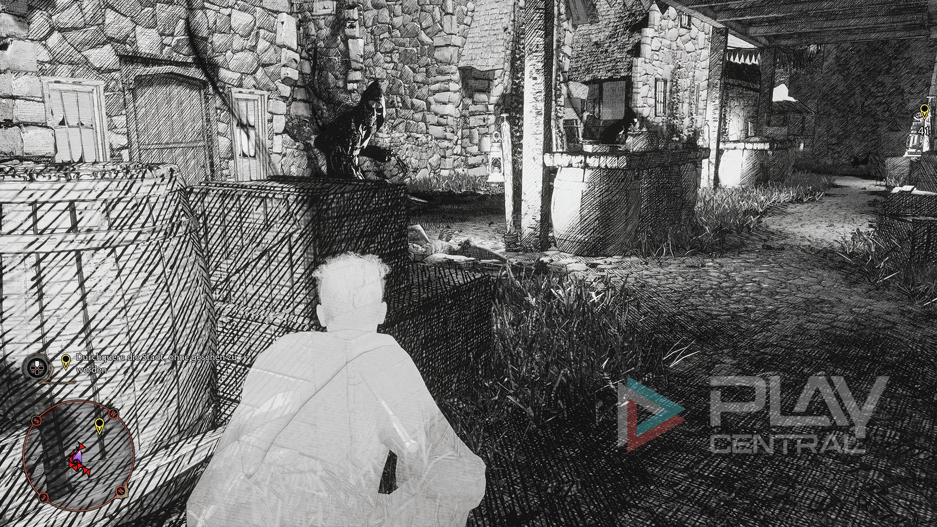 Sobald ihr das markierte Buch im Büro des Schulleiters Black geöffnet habt, werdet ihr in eine surreale Welt gesogen, in welcher Niamh die Regeln macht. Eure erste Aufgabe besteht darin, ein kleines gezeichnetes Dorf zu durchqueren, ohne von Handlangern des Tods gesehen zu werden. Dafür setzt ihr automatisch Desillusionierung ein.