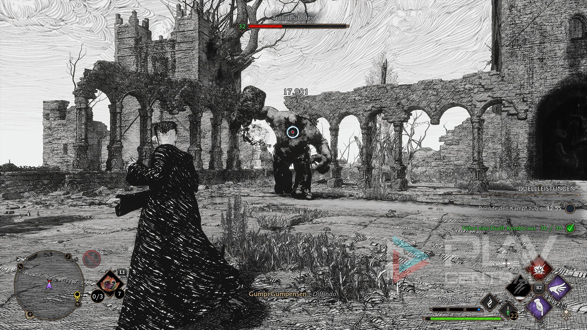 Beim Kampf, bei welchem der Tod das erste Mal selbst anwesend ist, solltet ihr in Bewegung bleiben und erst die Hunde, dann die Häscher und schließlich die Trolle ausschalten. Konzentriert ihr am Ende einzelne Standardattacken auf den Troll/die Trolle, könnt ihr auch viel leichter die Duell-Herausforderung schaffen, die eine 30er-Kombo verlangt.