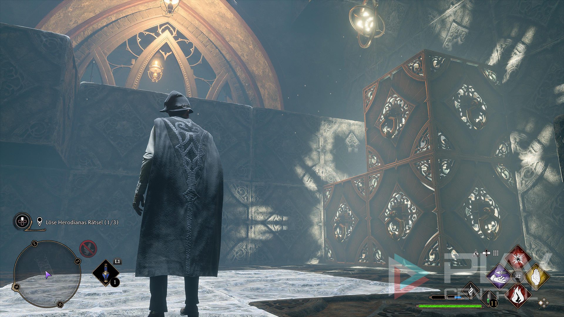 Im zweiten Raum: Stoßt den schwebenden Kubus links in Richtung Osten, also auf die andere Seite des Raums. Zieht dann die Würfel rechts mit Accio nach links. Schleudert sie anschließend ebenfalls nach Osten, wodurch die drei Würfel vereint werden. Zieht sie dann mit Accio nach rechts (Süden) und ihr habt eine Treppe zum nächsten Schatz: Herodianas Gewand.
