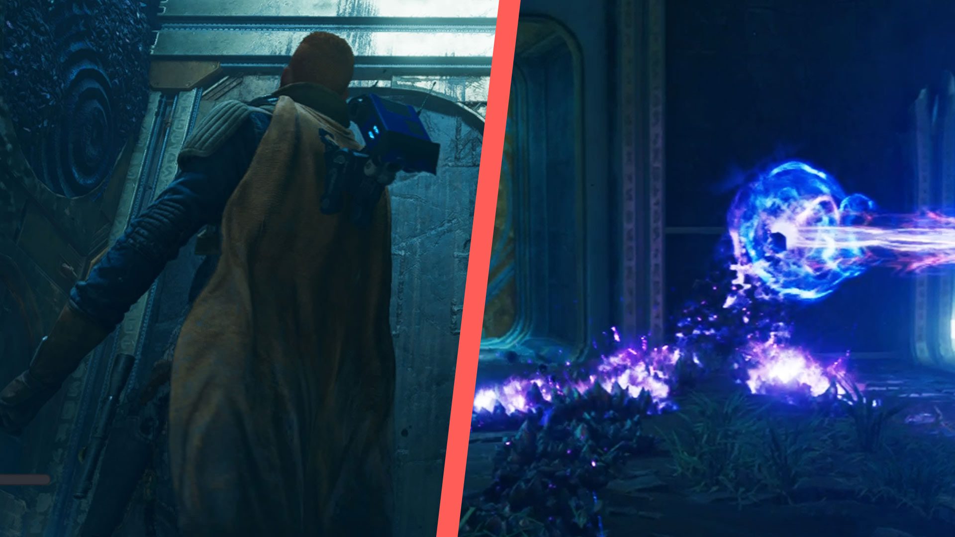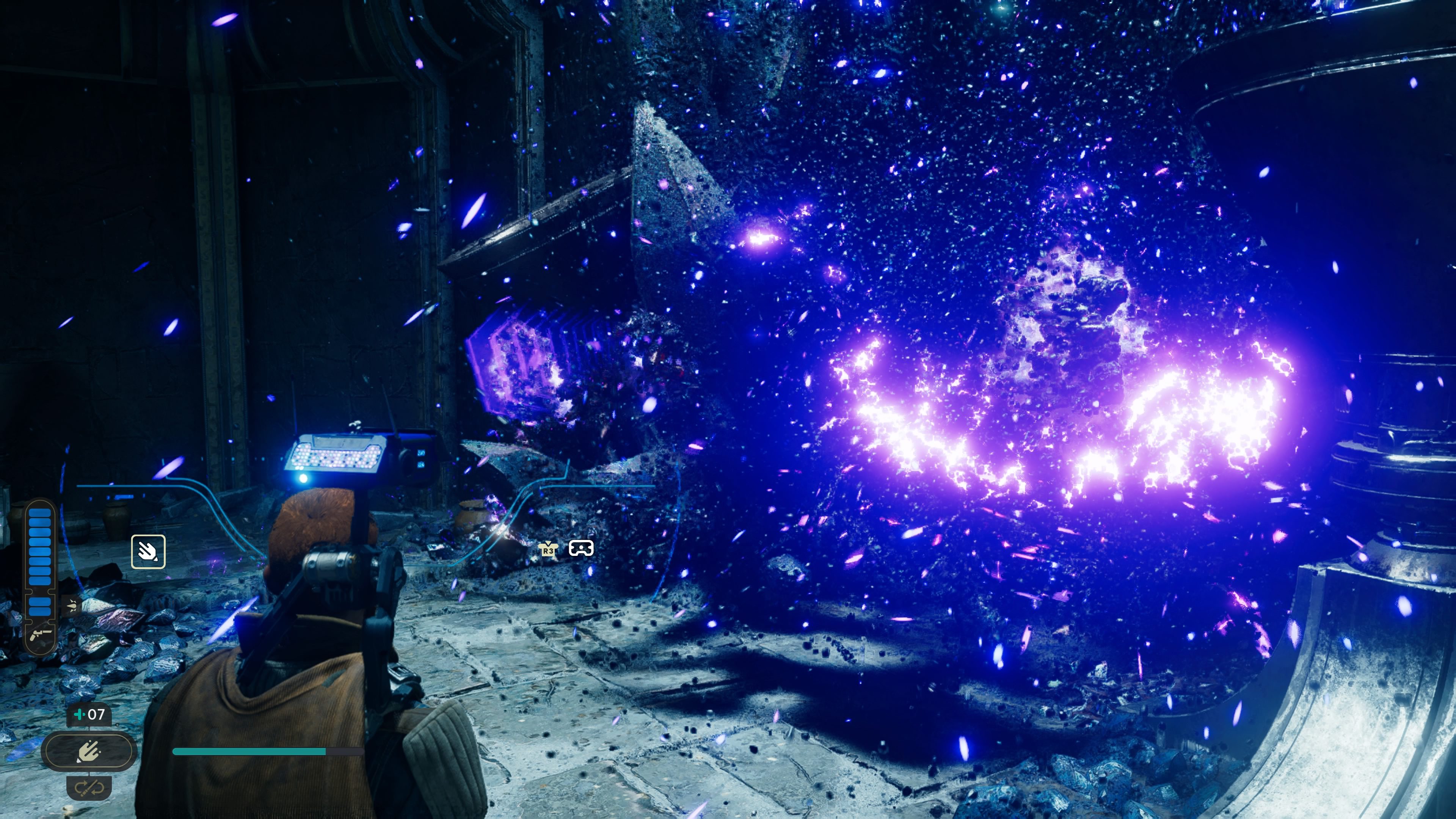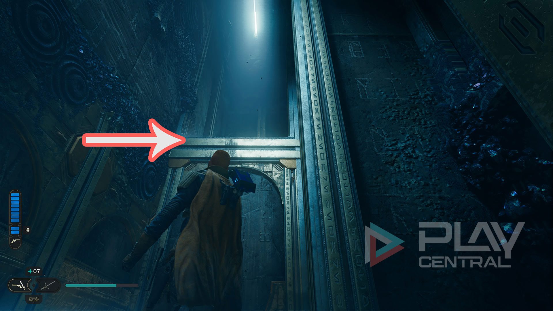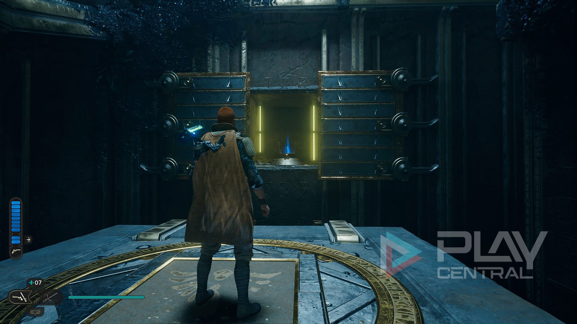 In der Jedi-Kammer angekommen lauft ihr ein Stück geradeaus und stellt euch mit Cal auf die Druckplattform, damit sich das Tor direkt vor euch öffnet. Dahinter erscheint nun eine blaue Kugel, die ihr euch per Macht-Fähigkeit schnappen könnt. Dreht euch danach um 180 Grad und schießt die Kugel in den Koppler mitten in der Kammer.