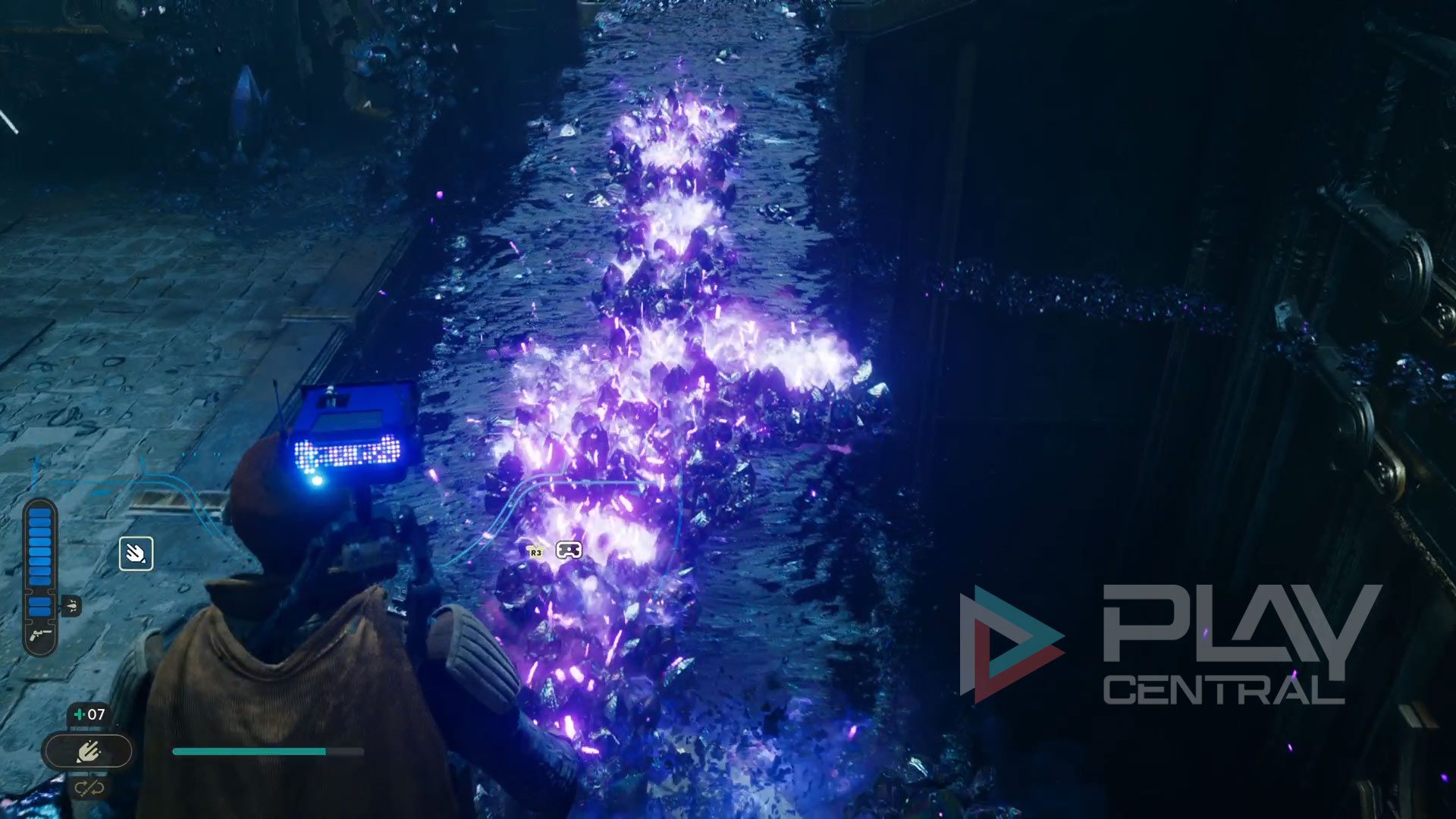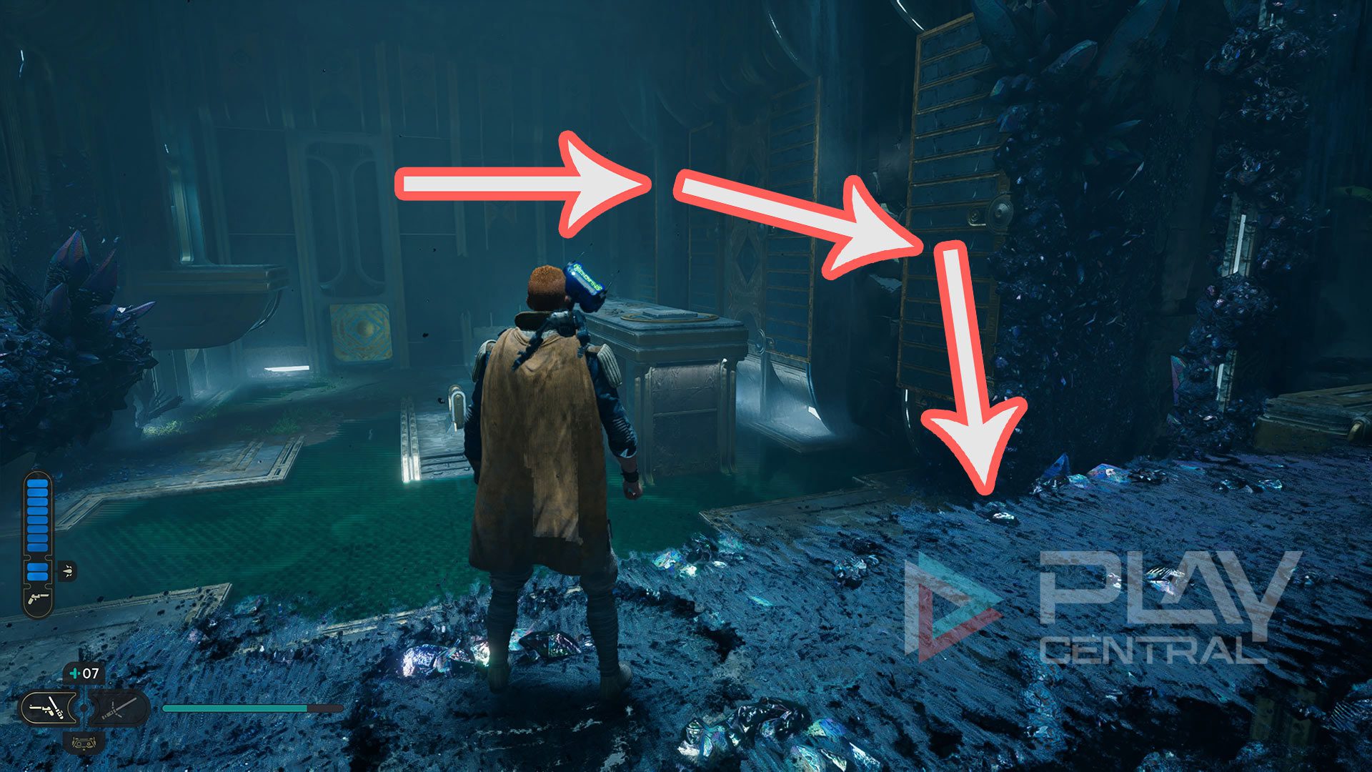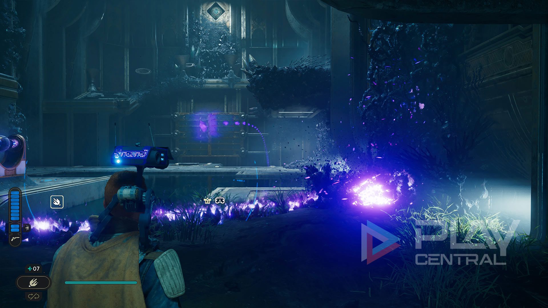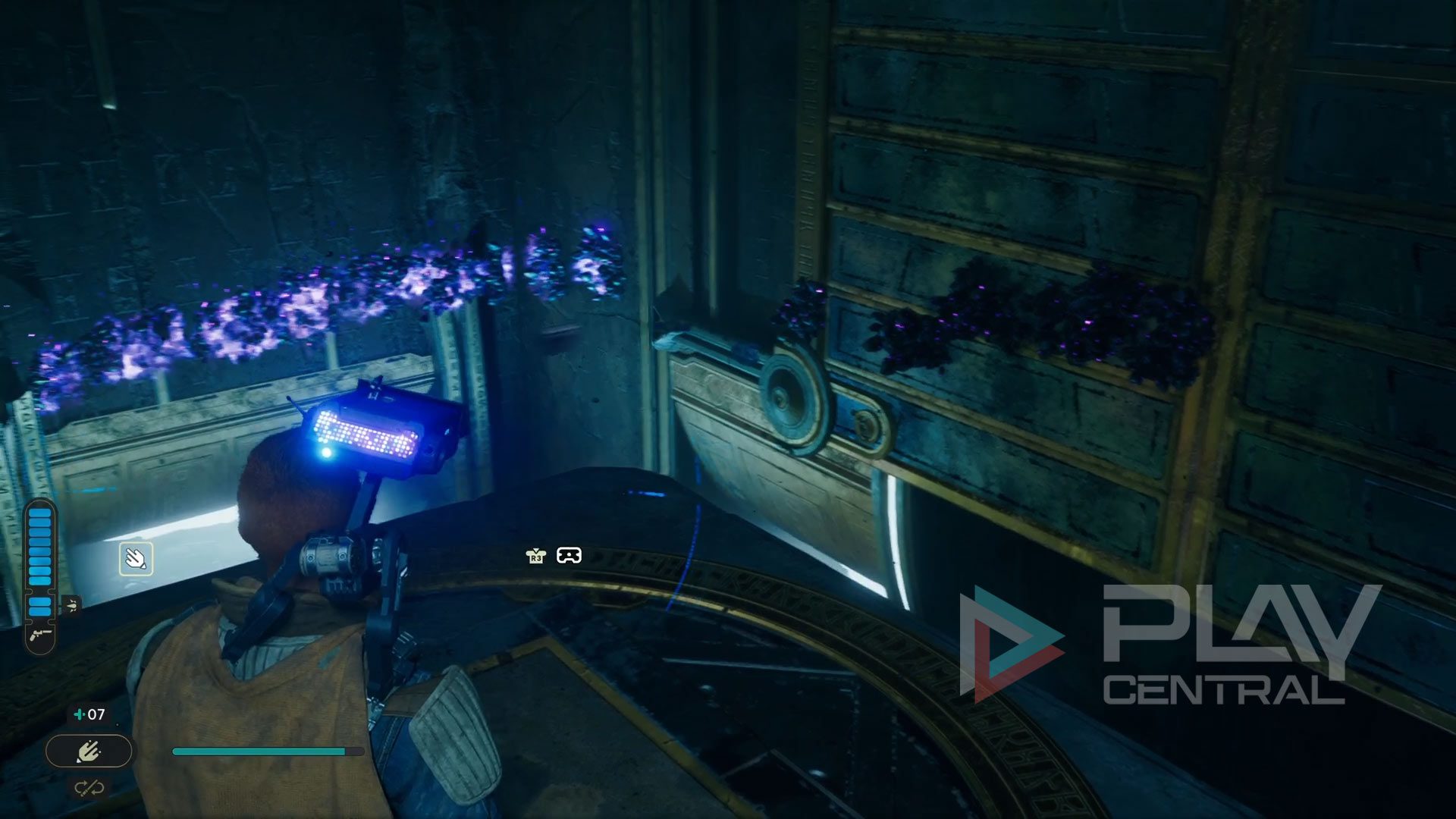 In der Jedi-Kammer angekommen lauft ihr ein Stück geradeaus und stellt euch mit Cal auf die Druckplattform, damit sich das Tor direkt vor euch öffnet. Dahinter erscheint nun eine blaue Kugel, die ihr euch per Macht-Fähigkeit schnappen könnt. Dreht euch danach um 180 Grad und schießt die Kugel in den Koppler mitten in der Kammer.