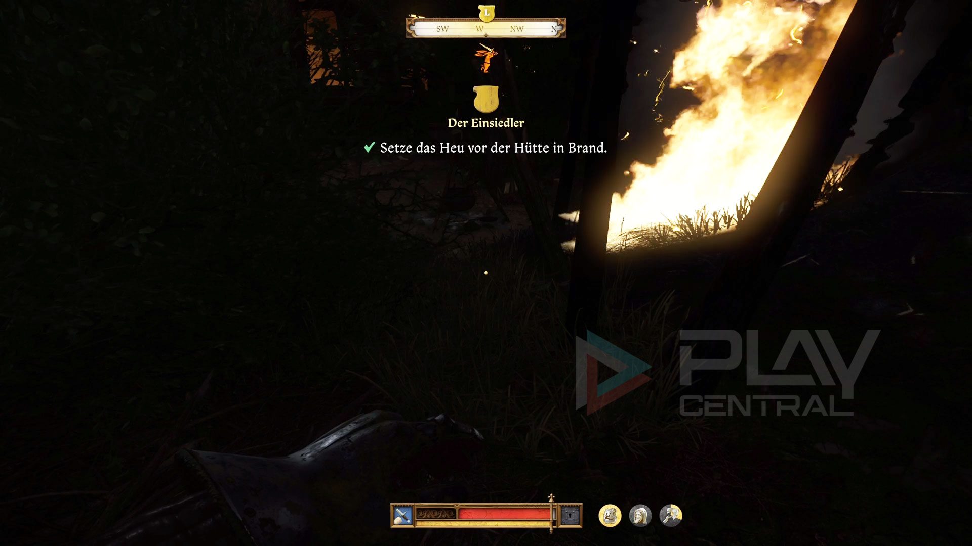 Möchtet ihr ihnen helfen, dann müsst ihr zu der Hütte schleichen und dort auf der rechten Seite den Heufhaufen entzünden. Dadurch bekommen die Ritter Schutz vor der Armbrust von Konrad und können angreifen. Wenn ihr wollt, helft beim Kampf, allerdings erfahrt ihr dann nicht, wo sich das Grab des Einsiedlers befindet.