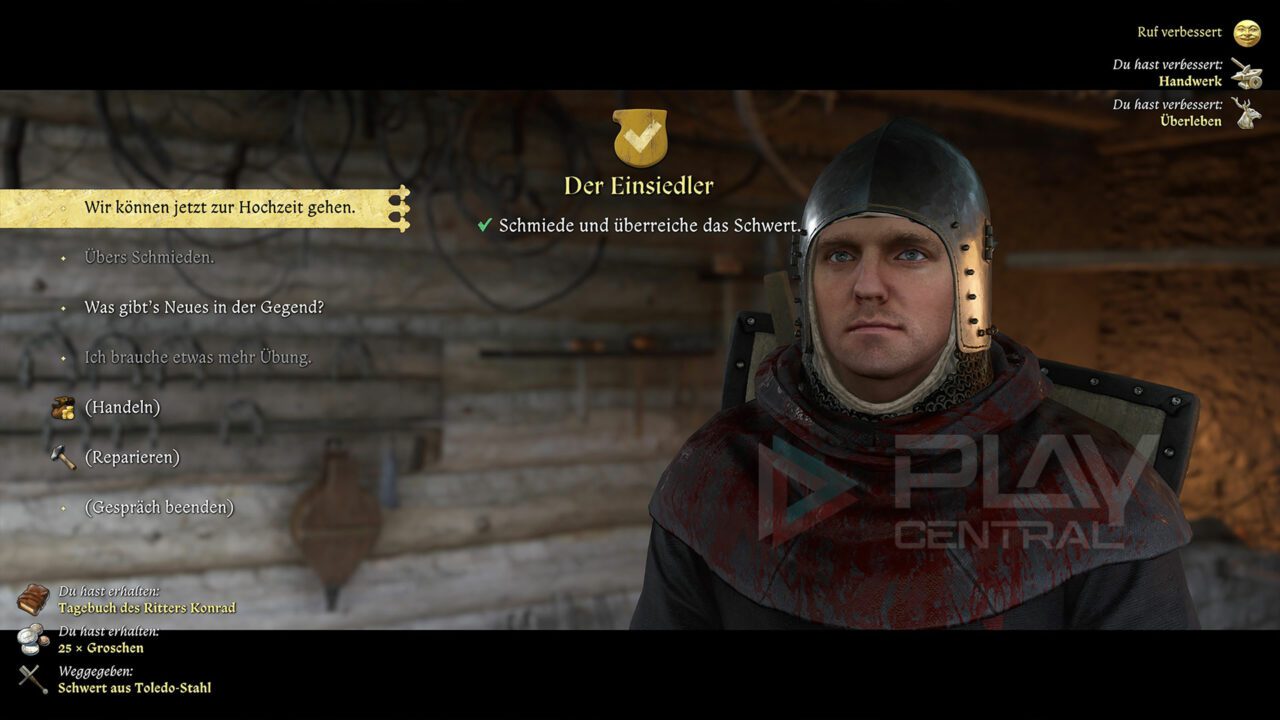 Ihr habt die Ehre, das Hochzeitsgeschenk für Herrn Semin selbst zu schmieden! Die Abläufe bei dem Minispiel unterscheiden sich dabei nicht von der Herstellung eines normalen Jagdschwerts. Seid ihr damit fertig, übergebt Radovan das Schwert und führt einen weiteren Dialog.