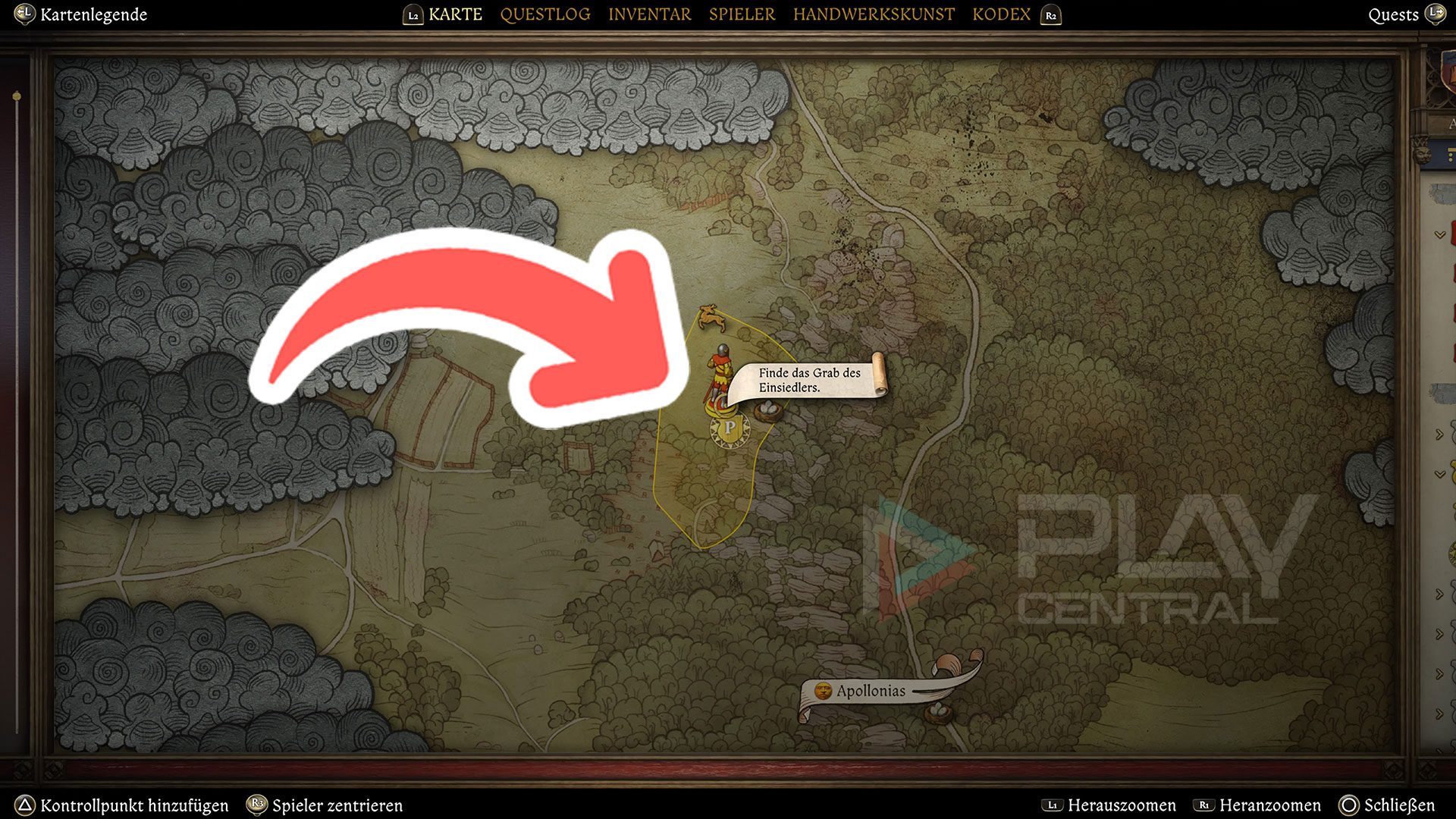 Jetzt ist es an der Zeit, um dem Einsiedler einen Besuch abzustatten. Ihr findet ihn an der markierten Stelle zwischen den Felsen.