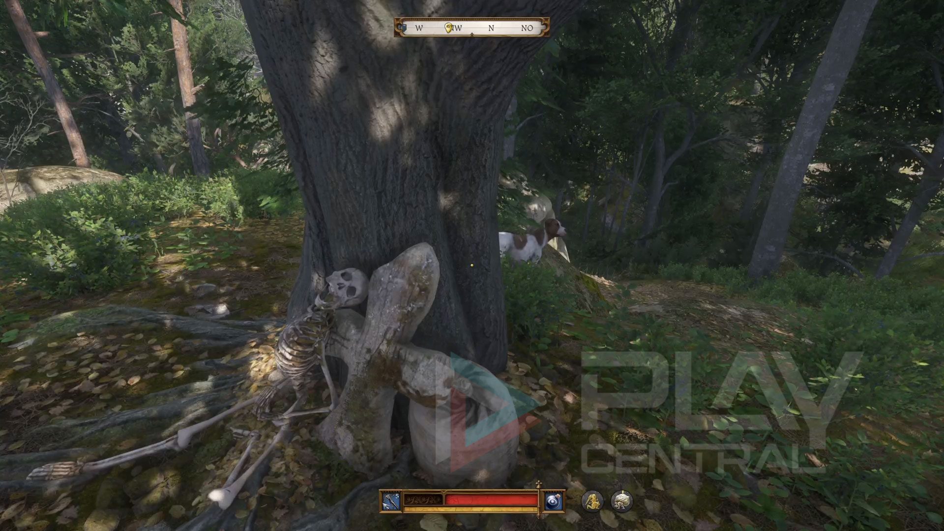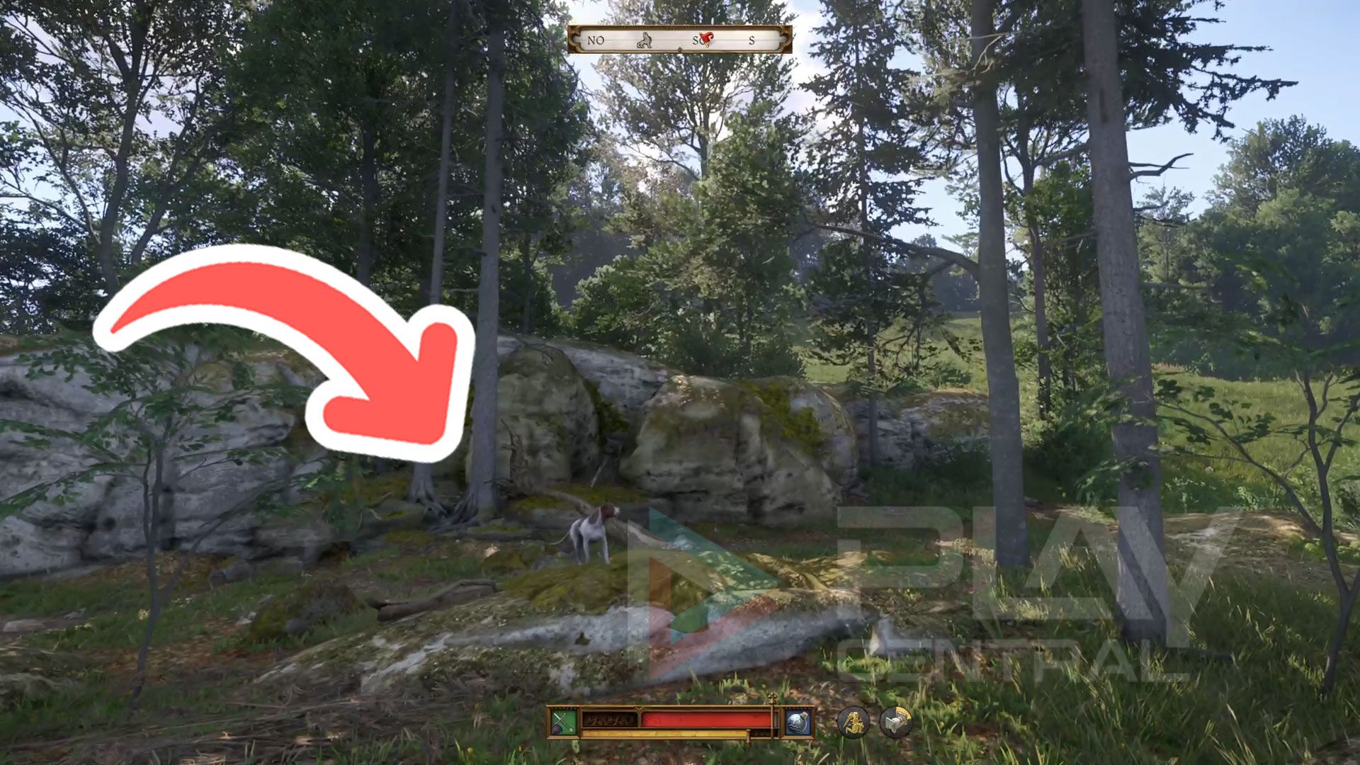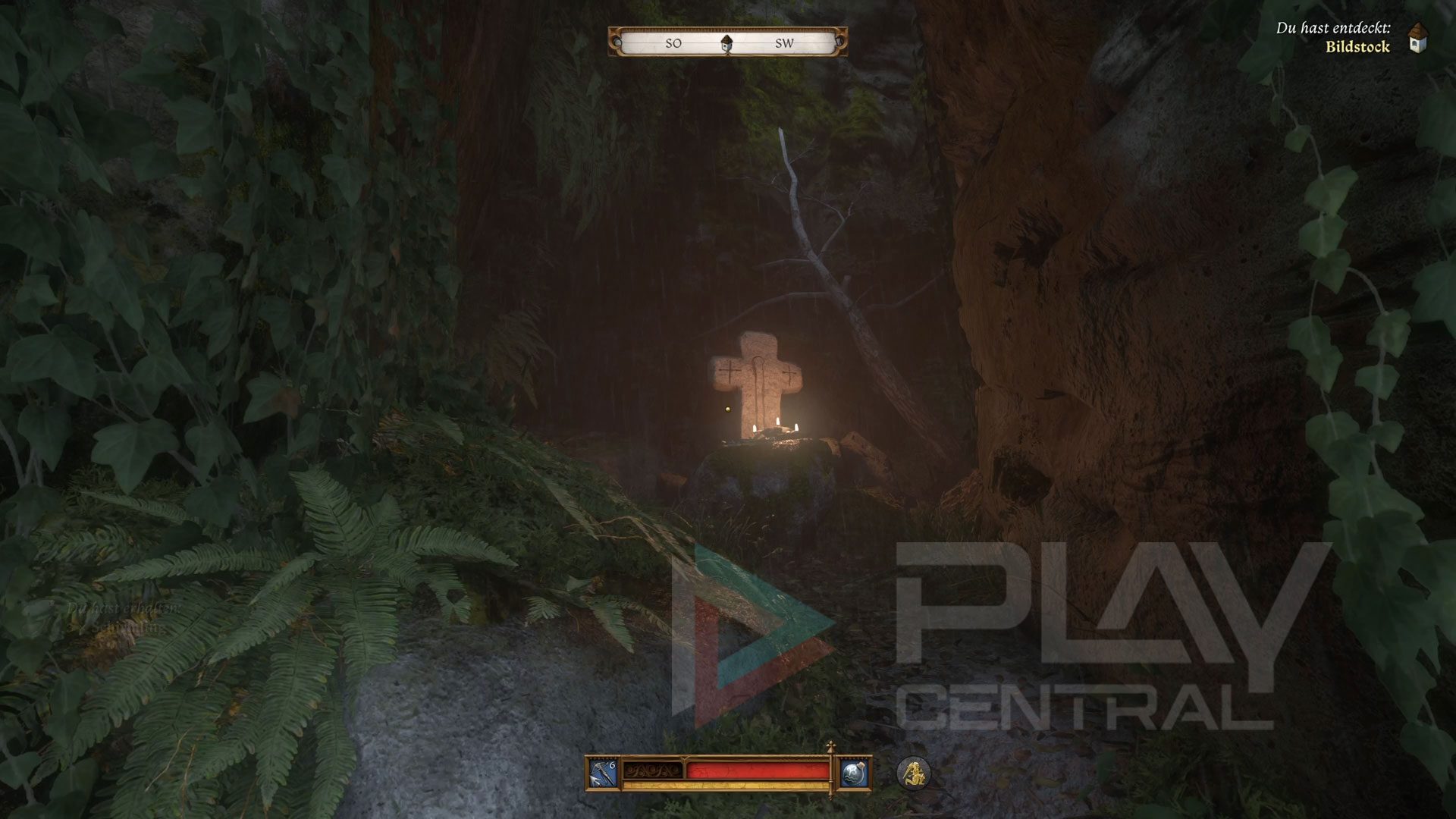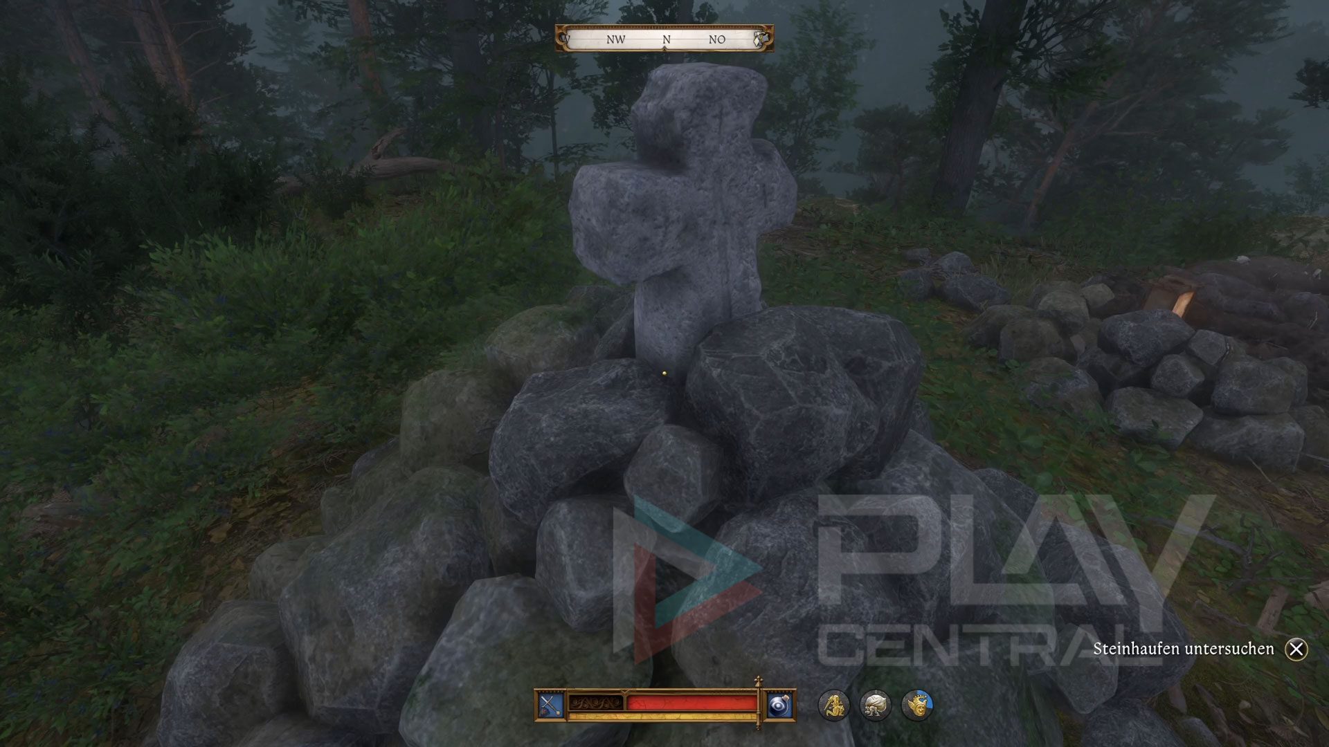 Die Belohnung sollen wir in einer Höhle im Walde des Königs finden. Es geht also in Richtung Norden den Hügel der Burg hinunter bis zum Waldrand. Steigt dort angekommen am besten vom Pferd und sucht nach den zwei großen Felsen, die sich auch auf eurer Karte gut erkennen lassen. Habt ihr sie gefunden, sollte Heinrich den Fund erneut kommentieren.