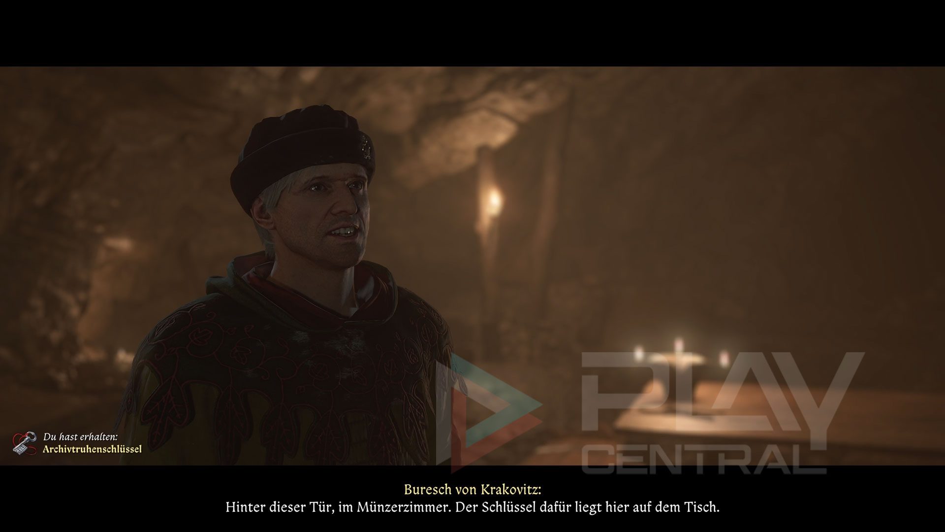 Zusätzlich erhaltet ihr den Archivtruhenschlüssel, mit dem sich eine Truhe öffnen lässt, in der ihr alles Nötige findet. Auf dem Tisch neben euch liegt zudem der Schlüssel zum Münzerzimmer. Als letztes könnt ihr in dem Dialog entscheiden, ob ihr ihn laufen lassen oder erledigen möchtet.