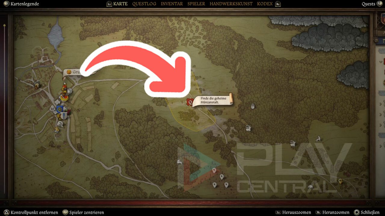 Wie gut, dass ihr zusätzlich die Karte zur geheimen Münzanstalt erhalten habt, auf der der Eingang eingezeichnet ist. Auf der folgenden Karte habe ich euch die genaue Stelle aber noch einmal markiert: