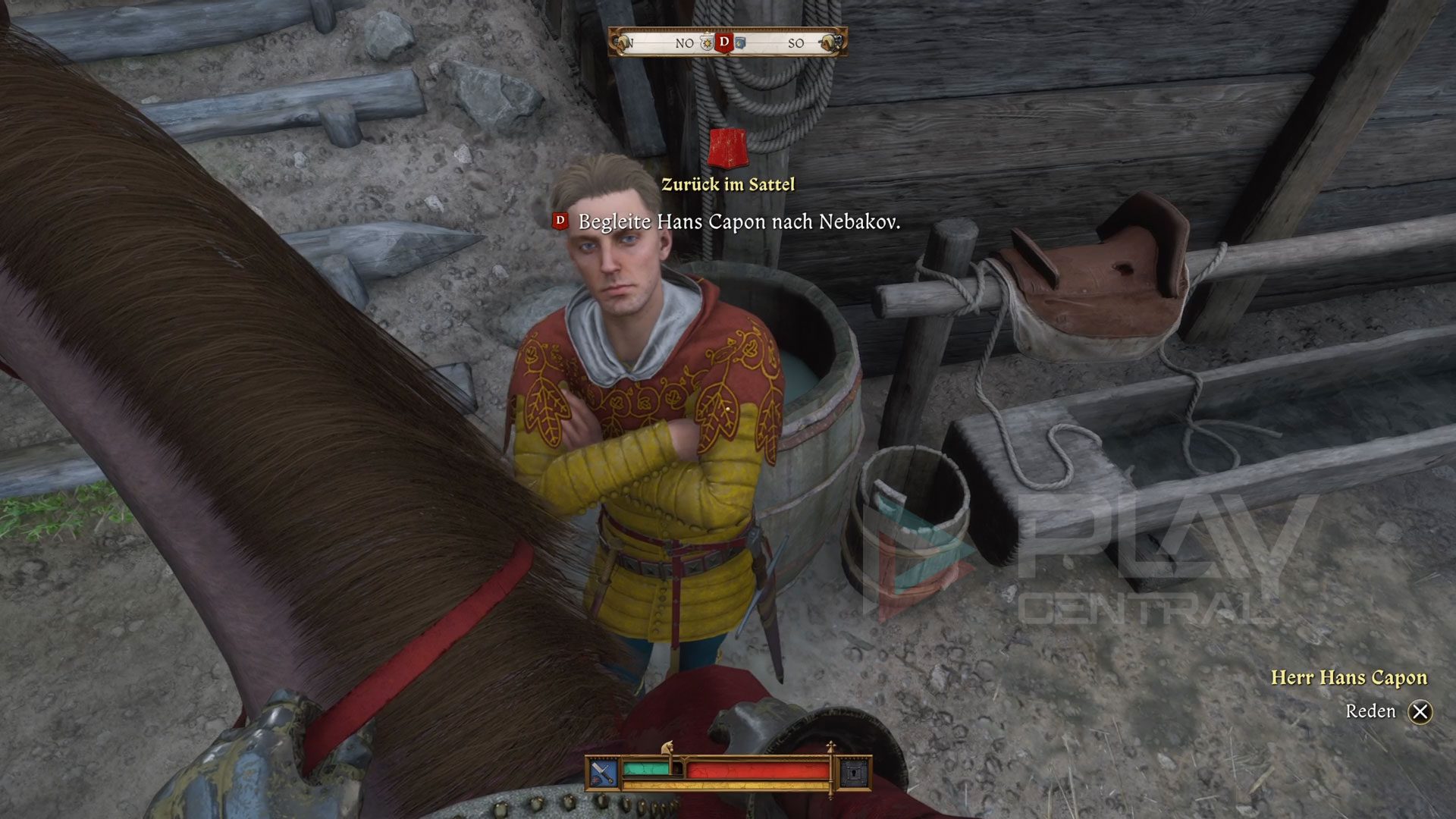 Wenn ihr euch entschieden habt, teilt eure Wahl dem Gehilfen mit, rüstet dann im Menü eures Pferdes das neue Reitzeug aus und sprecht vor dem Tor mit Herrn Hans. Nach einem kurzen Gespräch brecht ihr nach schließlich Nebakov auf.
