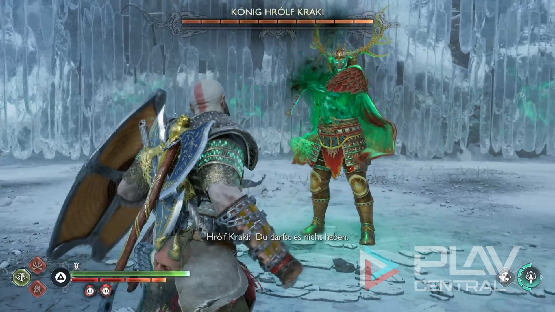 Da Hrolf Kraki der König der Berserker ist, vereint er sämtliche Angriffe seiner Untertanen. Ihr wisst also nie, was auf euch zukommt und welche Elemente er als nächstes nutzen wird. Ihr müsst jederzeit mit allem rechnen und deshalb das Kampfsystem von „God of War Ragnarök“ bis ins Detail verstanden haben.