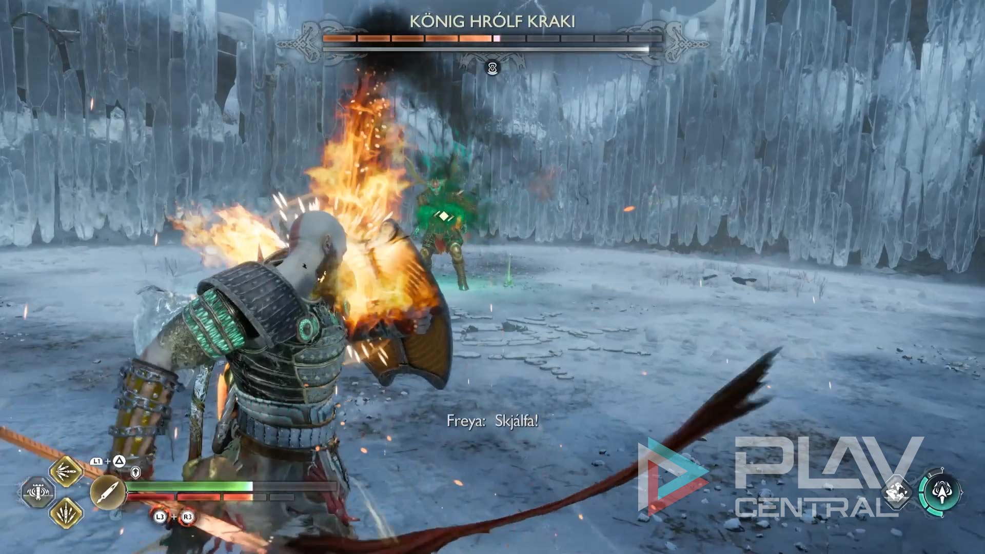 Wechselt wieder zur Axt und schlagt weiter auf den König ein, bis euer Permafrost komplett gefüllt ist. Das erkennt ihr daran, dass über Krato’s Gesundheitsleiste L1 + Dreieck angezeigt wird. Mit dieser Tastenkombination löst ihr die nächste Weltenverschiebung aus, um weiter Schaden auszuteilen. Gleichzeitig solltet ihr Freyas Spezialattacke aktivieren und sie pausenlos Pfeile abfeuern lassen.