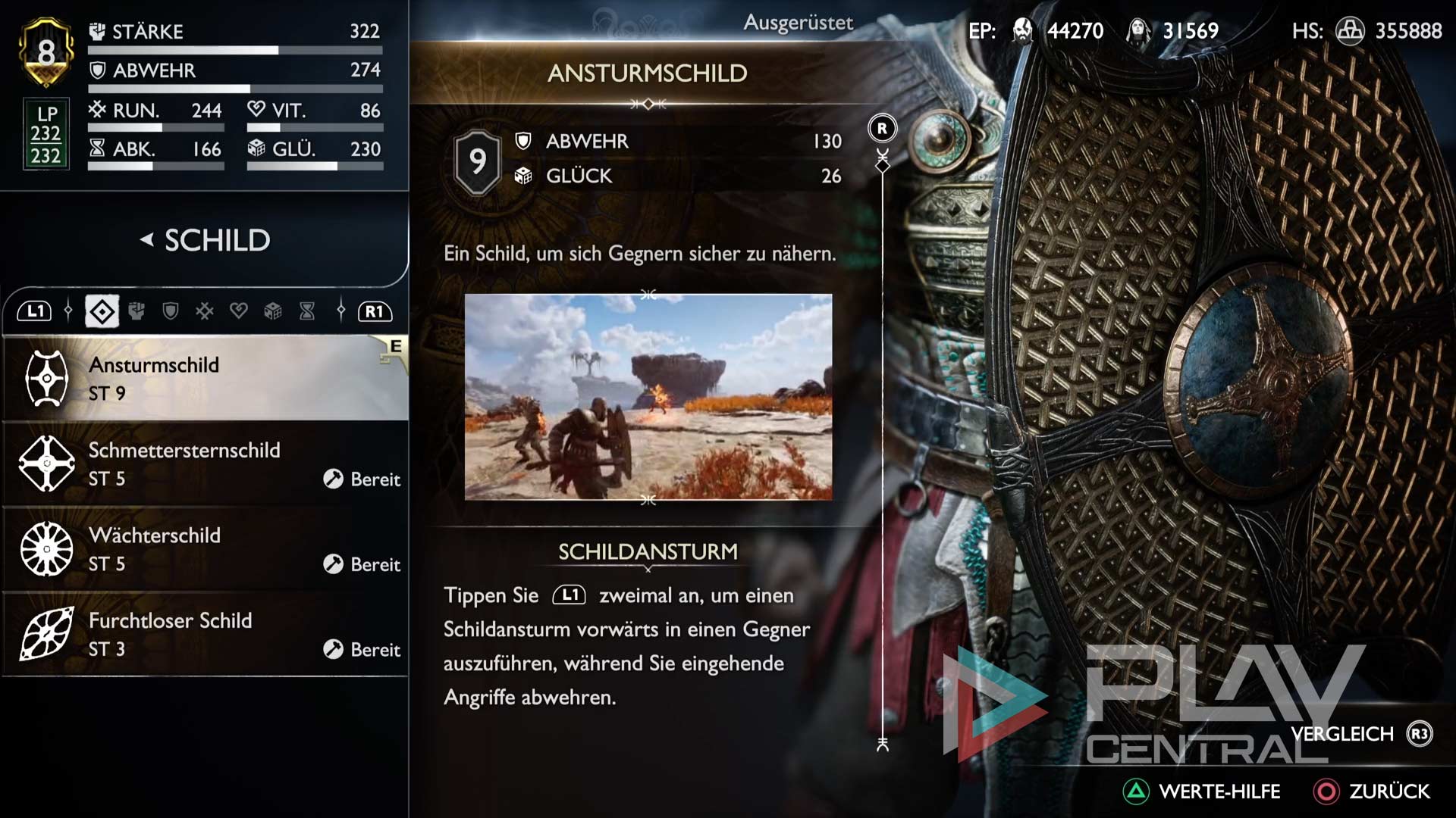 Als Schild empfehlen wir euch das Ansturmschild. Denn wenn ihr im Kampf zweimal L1 antippt, führt Kratos einen Schildansturm vorwärts aus, während eingehende Angriffe abgewehrt werden.