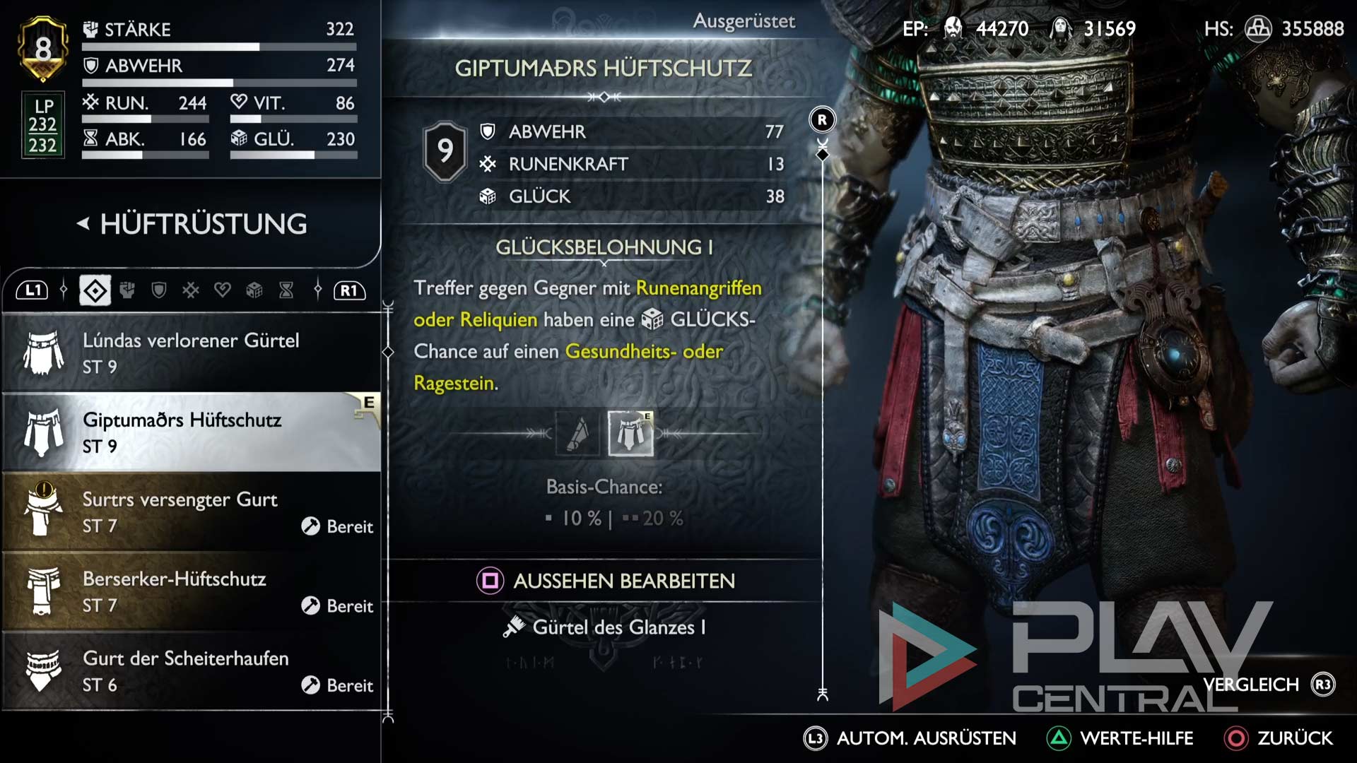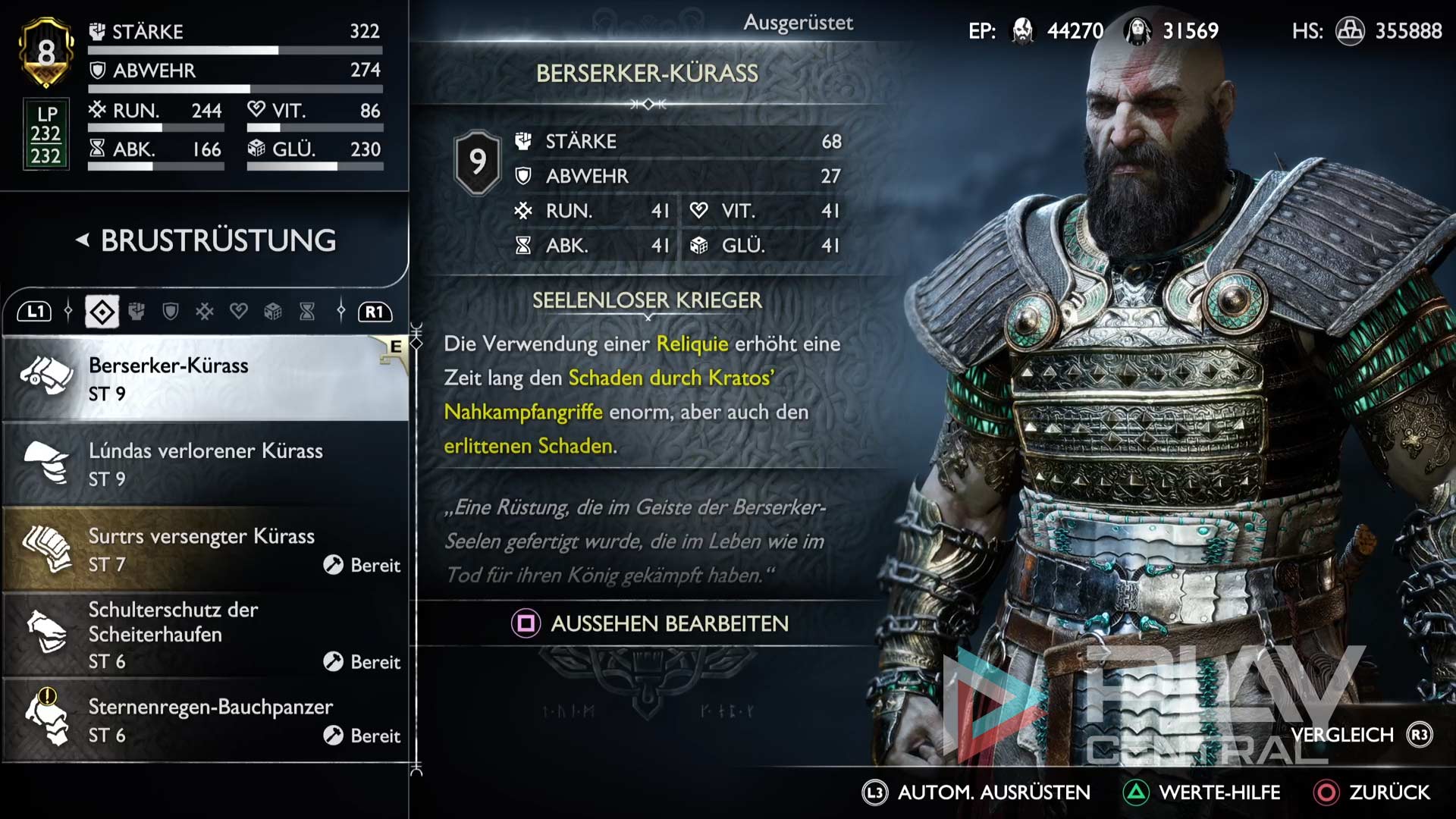 Bei Kratos‘ Brustrüstung haben wir uns für die Berserker-Kürass entschieden. Schließlich wird hierbei durch die Verwendung einer Reliquie eine Zeit lang der Schaden durch Kratos‘ Nahkampfangriffe enorm erhöht, allerdings auch der erlittene Schade. Zusätzlich liegt die Stärke bei ordentlichen 68 Punkten, wodurch der Schaden aller Angriffe und Fertigkeiten erhöht wird.