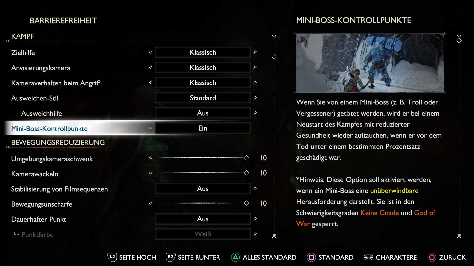 Hinweis: Diese Option soll aktiviert werden, wenn ein Mini-Boss eine unüberwindbare Herausforderung darstellt. Sie ist in den Schwierigkeitsgraden Keine Gnade und God of War gesperrt.