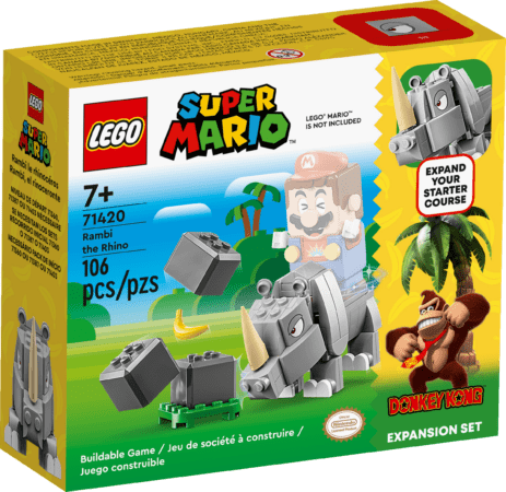 Natürlich darf in der Donkey Kong-Familie Rambi das Rhino nicht fehlen. In dem neuen Erweiterungsset kannst du die (nicht im Set enthaltenen) interaktiven Figuren Mario, Luigi oder Peach auf dem Rücken von Rambi dem Rhino reiten lassen.