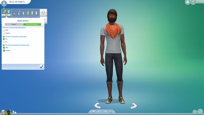 Sims […] haben keine vorherbestimmte Vorliebe für ein bestimmtes Geschlecht, die Anziehungskraft kann sich während des Spiels ändern und sie können Techtelmechtel mit jedem Geschlecht haben. Dies ist immer noch der Standardstatus für einen neuen Sim.“