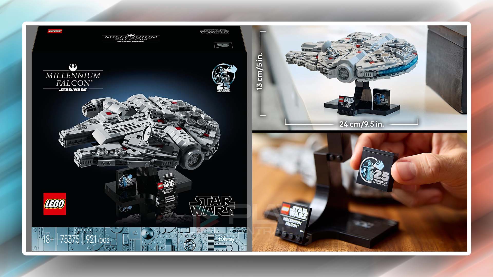Dem Millenium Falcon liegen ein Stein zum 25-jährigen LEGO Star Wars-Jubiläum und ein Namensschild bei. Dieses Set entspringt einer Baureihe mittleren Maßstabs, die wirklich überall hinpasst. Auf dem Wohnzimmerschrank, dem Schreibtisch oder doch ins Regal? Ihr entscheidet.