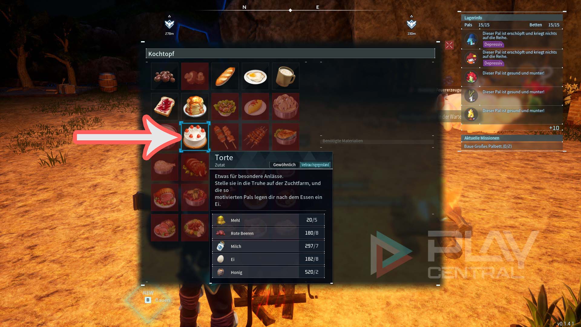 Um die Zuchtfarm überhaupt erst in Betrieb nehmen zu können, müsst ihr euch jetzt Gedanken um die Versorgung mit Torten machen. Klingt merkwürdig, ist in Palworld aber eine Voraussetzung, damit die Pal überhaupt erst loslegen mit dem Liebe machen, sozusagen.